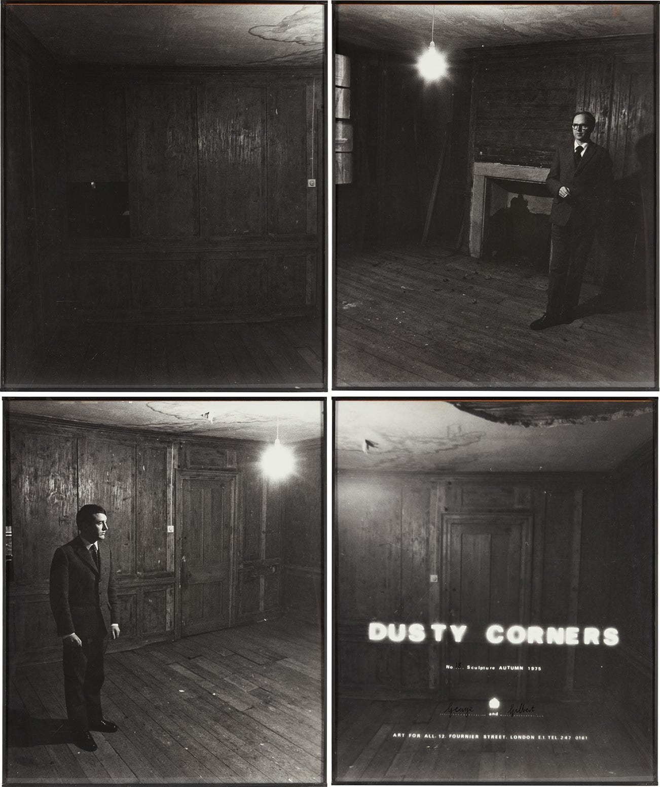 Belonging to a discrete series of 21 works, Dusty Corners No. 18, 1975, depicts the celebrated British duo Gilbert & George in their home and studio in Spitalfields Market in London. Four photographs arranged in a grid, the present work highlights the artists’ quintessential use of text and image. In the Dusty Corners series, Gilbert & George allow the viewer entry into 12 Fournier Street, as it is explicitly typed in the fourth image. The address is located in the East End in London, an area historically known for being the home of button-makers, furriers and hat-makers and collectively known as a garment district – an apt location as the artistic duo was renowned not only for their art but also their fashion trademark: perfectly tailored matching suits. The two artists moved into the area in 1968 while they were both studying sculpture at Saint Martin's School of Art, to what they deemed the cheapest flat they could find. Their entire body of work has been and continues to be created in this townhouse, making them true icons of the neighborhood. As George explains, "Nothing happens in the world that doesn't happen in the East End” (George, quoted in Anna van Praagh, “Gilbert and George: ‘Margaret Thatcher did a lot for art’”, Telegraph, July 5, 2009, online).