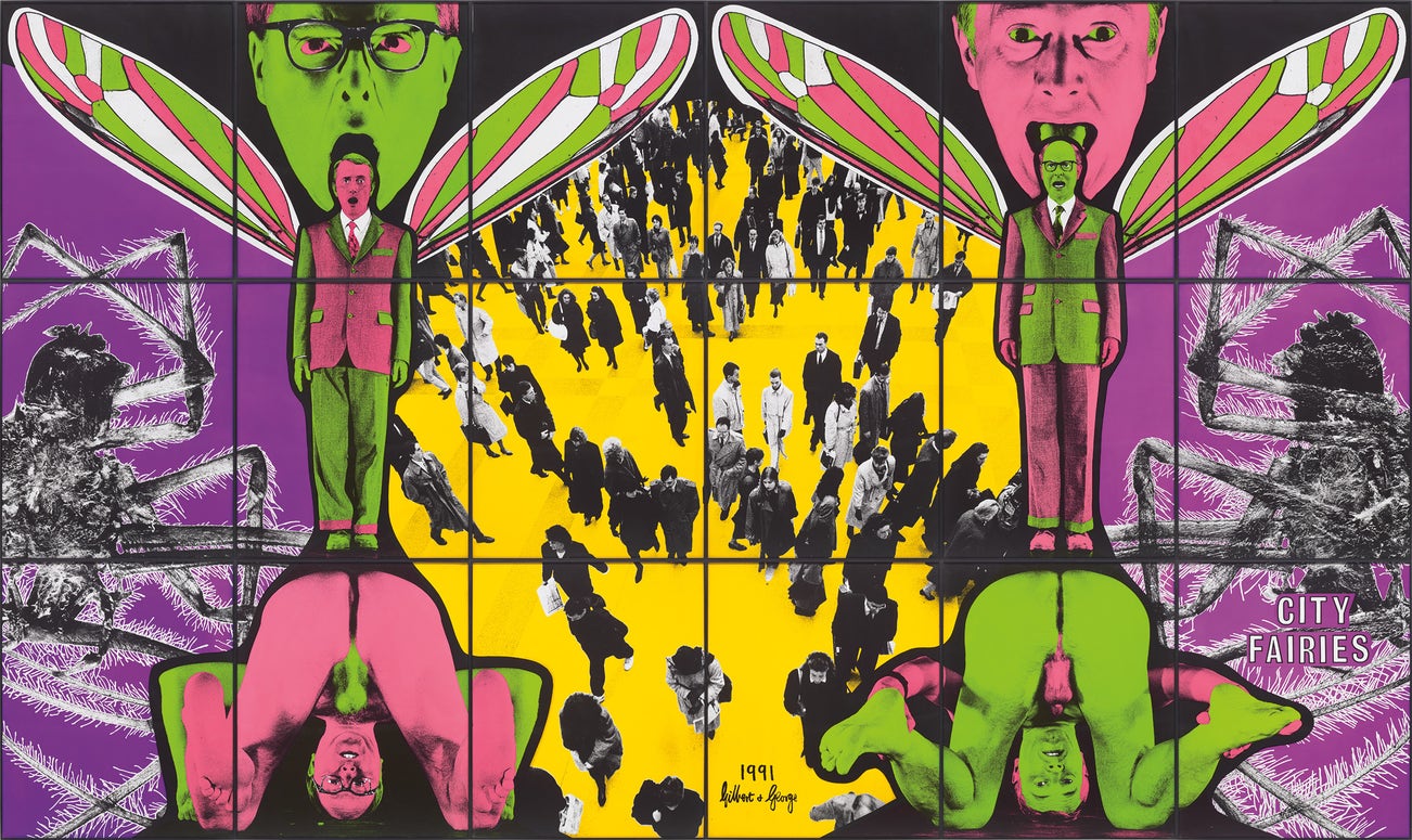 signed and dated '1991 Gilbert & George' lower centre; further titled 'CITY FAIRIES' lower right