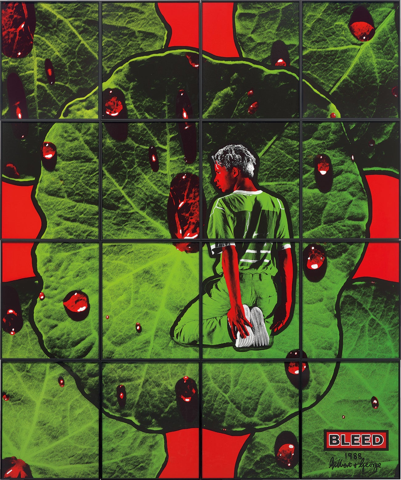signed, titled and dated 'BLEED 1988 Gilbert & George' lower right ; further consecutively numbered '1-16' on the reverse of each part
