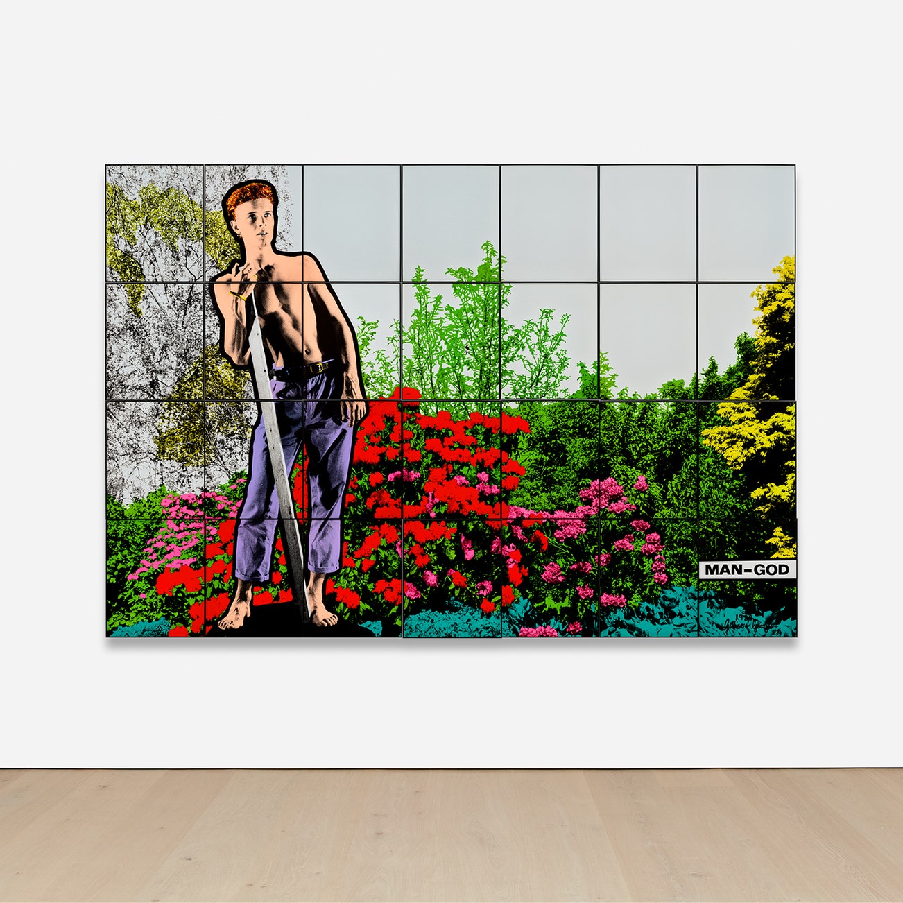 signed and dated "Gilbert & George 1988" lower right of the lower right panel; each titled and consecutively numbered "Man-God [1-28]" on the reverse of the backing board