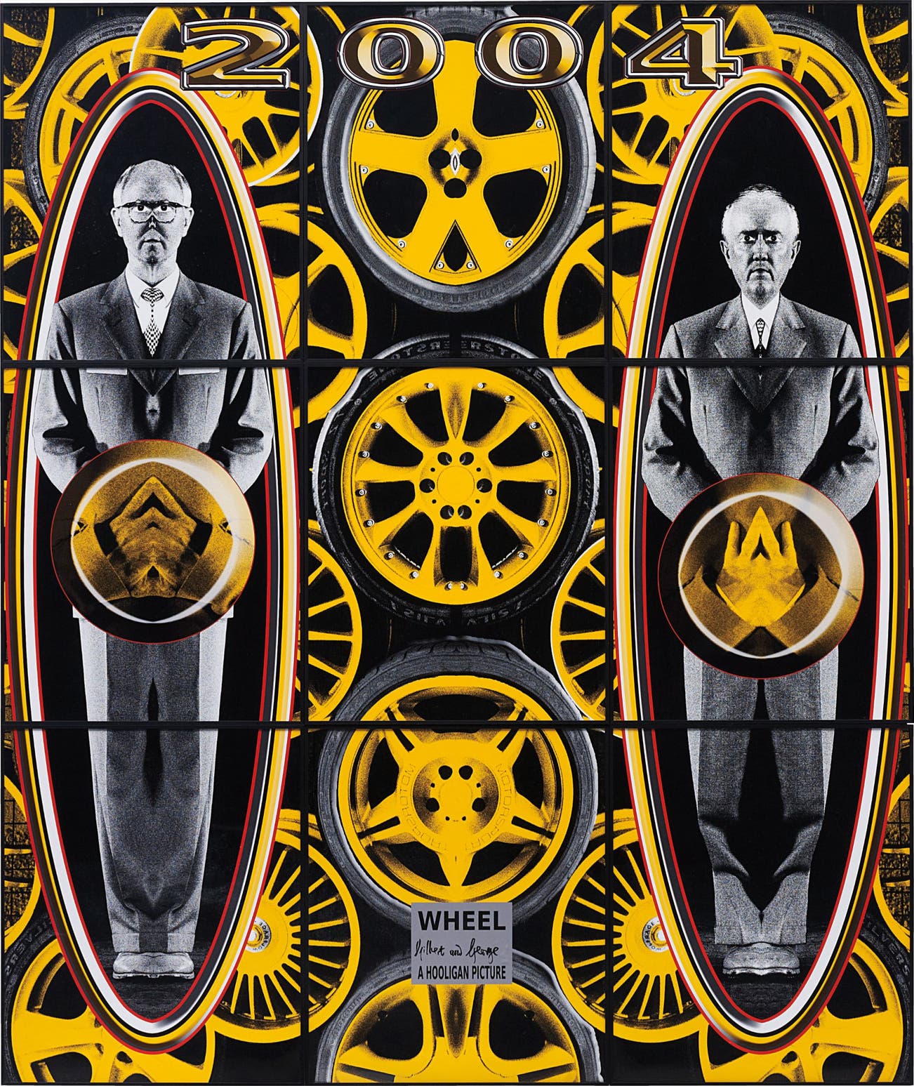 Though Gilbert & George employ several art historical themes within this piece, they have also sampled the contemporary urban styles within this work. The elevation of the wheels from luxury material item to high art imagery, along with the large “2004” stretching across the top of the work, repurpose tropes particular to the design of Hip-hop music albums. This is reinforced with the use of the Ferrari logo colors as the palette for this work. Wheel is a harmonious mix of art historical forms and ideals of symmetry repurposed using the tropes of Hip-hop aesthetic and shows the commitment the artists have to their motto: “Art for All”.