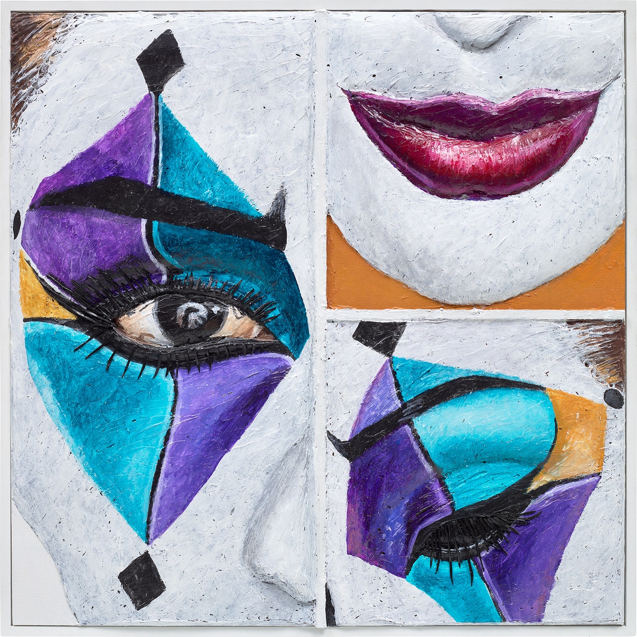 acrylic and foam on canvas mounted on panel, in artist's frame