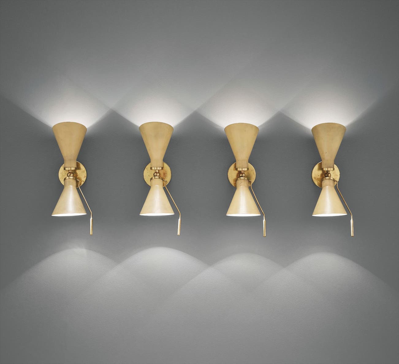 Rising above the devastation of World War II, post-war Italian design reached new heights of productivity and ingenuity, particularly in the realm of lighting. Gino Sarfatti is among the most celebrated lighting designers from this fruitful period. Before founding his company Arteluce in 1939, Sarfatti studied aeronautical engineering. He brought the inventiveness of a self-taught outsider to the field of lighting design, while his mechanical background lent lightness and ingenuity of construction. Poetic underpinnings are also evident in lamps such as model no. 1034 (sometimes referred to as the "Vine" lamp), which features a nearly 8' twisting brass stem graced with nine delicate, articulating white shades like buds on a flower.