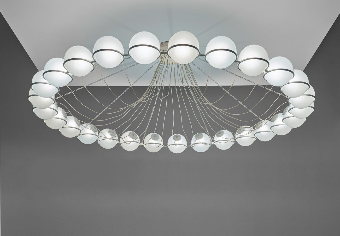Italian | B. 1912 D. 1985Rising above the devastation of World War II, post-war Italian design reached new heights of productivity and ingenuity, particularly in the realm of lighting. Gino Sarfatti is among the most celebrated lighting designers from this fruitful period. Before founding his company Arteluce in 1939, Sarfatti studied aeronautical engineering. He brought the inventiveness of a self-taught outsider to the field of lighting design, while his mechanical background lent lightness and ingenuity of construction. Poetic underpinnings are also evident in lamps such as model no. 1034 (sometimes referred to as the "Vine" lamp), which features a nearly 8' twisting brass stem graced with nine delicate, articulating white shades like buds on a flower.