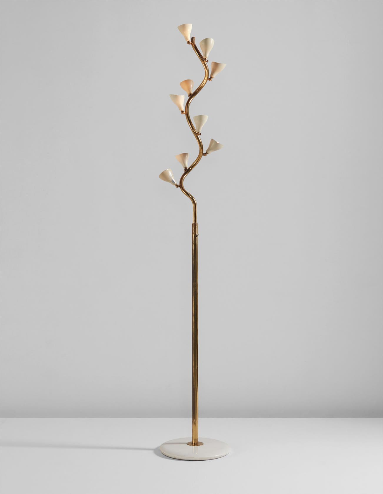 Italian | B. 1912 D. 1985Rising above the devastation of World War II, post-war Italian design reached new heights of productivity and ingenuity, particularly in the realm of lighting. Gino Sarfatti is among the most celebrated lighting designers from this fruitful period. Before founding his company Arteluce in 1939, Sarfatti studied aeronautical engineering. He brought the inventiveness of a self-taught outsider to the field of lighting design, while his mechanical background lent lightness and ingenuity of construction. Poetic underpinnings are also evident in lamps such as model no. 1034 (sometimes referred to as the "Vine" lamp), which features a nearly 8' twisting brass stem graced with nine delicate, articulating white shades like buds on a flower.