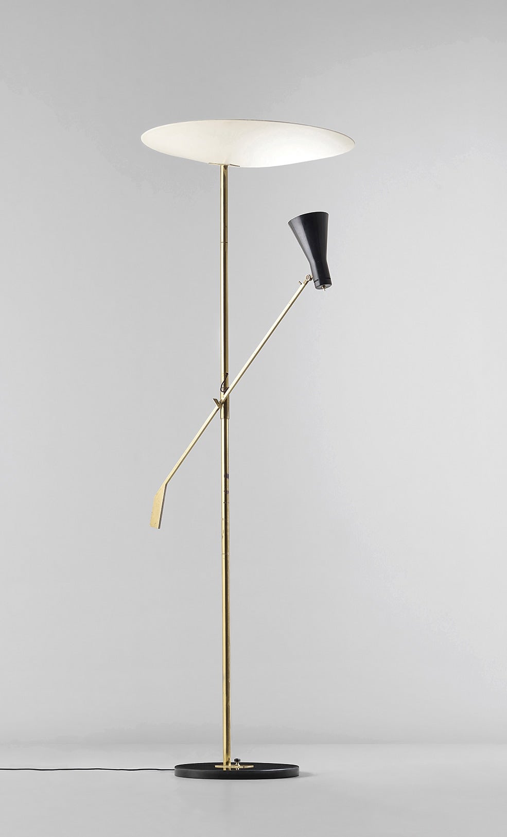 The present standard lamp was commissioned by the architect and architectural historian Liliana Grassi, a friend of Gino Sarfatti, for her residence in Milan. This rare version features a black marble base, a variation from the original model, no. 1050, designed in 1951, which has a ribbon-shaped brass base. The design of both versions illustrates the influence of the architect Vittoriano Viganò, an artistic and technical advisor for Arteluce, whom Sarfatti entrusted as artistic director of the company during an extended trip to the United States in the early 1950s. For example, Sarfatti's incorporation of a large articulated brass arm with an aluminium cone-shaped shade — the only light source — serves both practical and aesthetic functions. This adjustable shade can be positioned for direct light or turned towards the large sculptural shade above for indirect light.