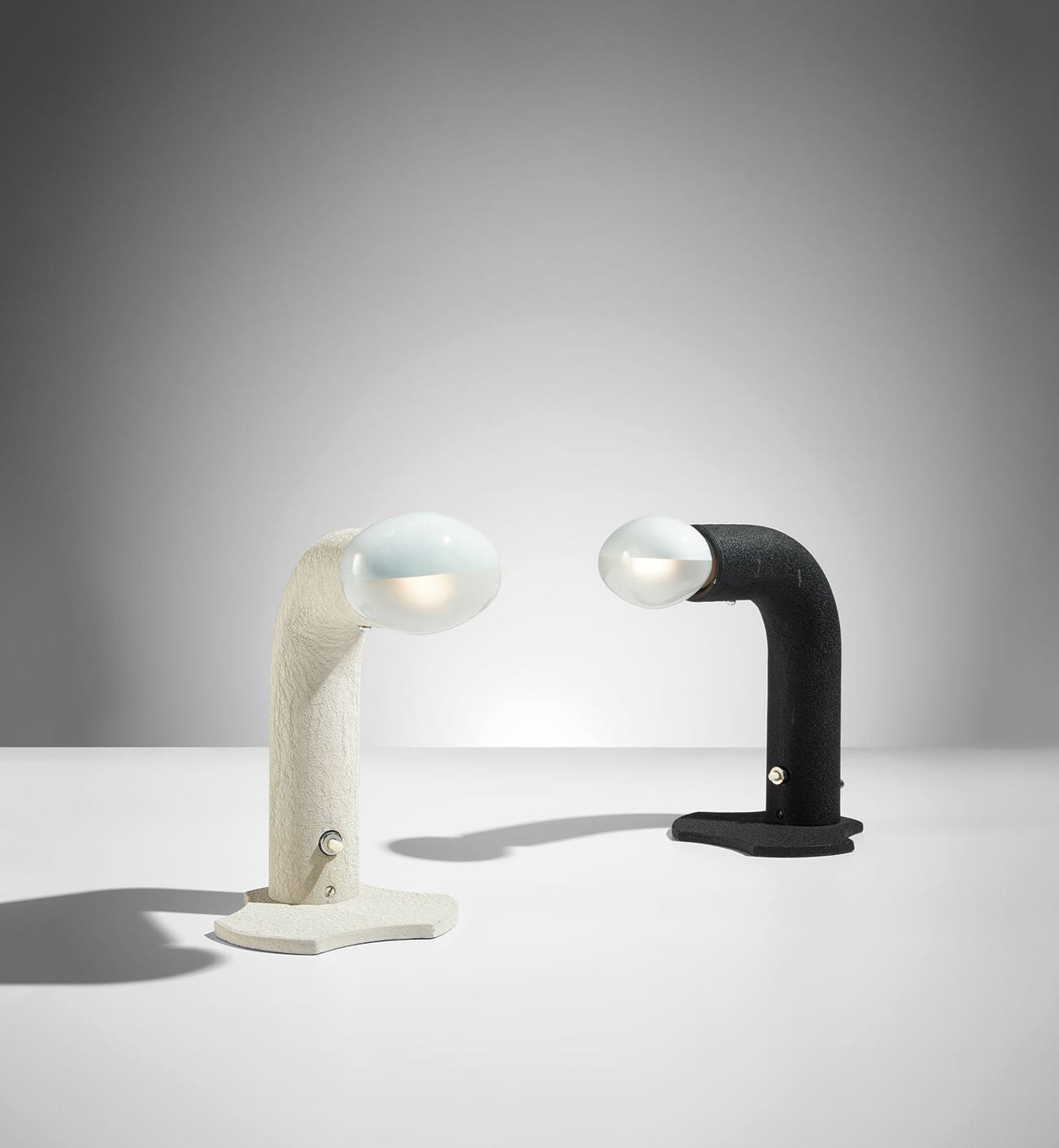 Manufactured by Arteluce, Milan, Italy. Interior of white lamp with manufacturer’s paper label printed AL/MILANO/ARTELUCE and interior of black lamp with remnants of manufacturer's paper label.