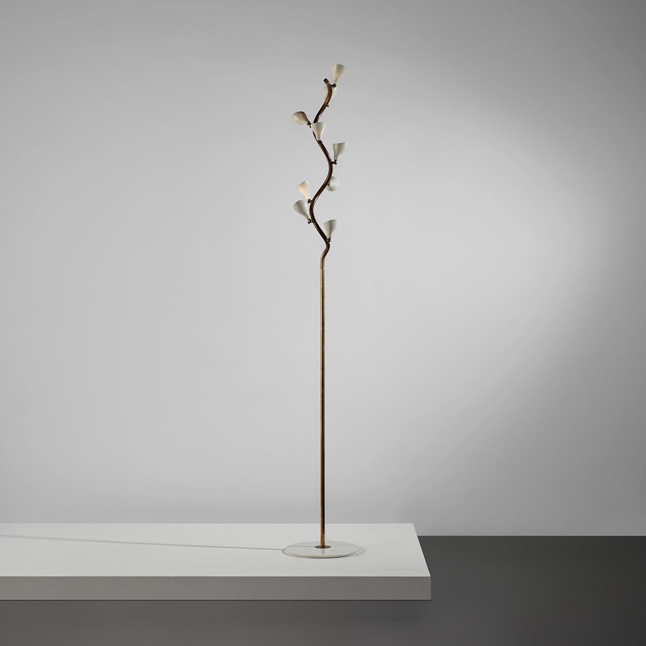 Rising above the devastation of World War II, post-war Italian design reached new heights of productivity and ingenuity, particularly in the realm of lighting. Gino Sarfatti is among the most celebrated lighting designers from this fruitful period. Before founding his company Arteluce in 1939, Sarfatti studied aeronautical engineering. He brought the inventiveness of a self-taught outsider to the field of lighting design, while his mechanical background lent lightness and ingenuity of construction. Poetic underpinnings are also evident in lamps such as model no. 1034 (sometimes referred to as the "Vine" lamp), which features a nearly 8' twisting brass stem graced with nine delicate, articulating white shades like buds on a flower.