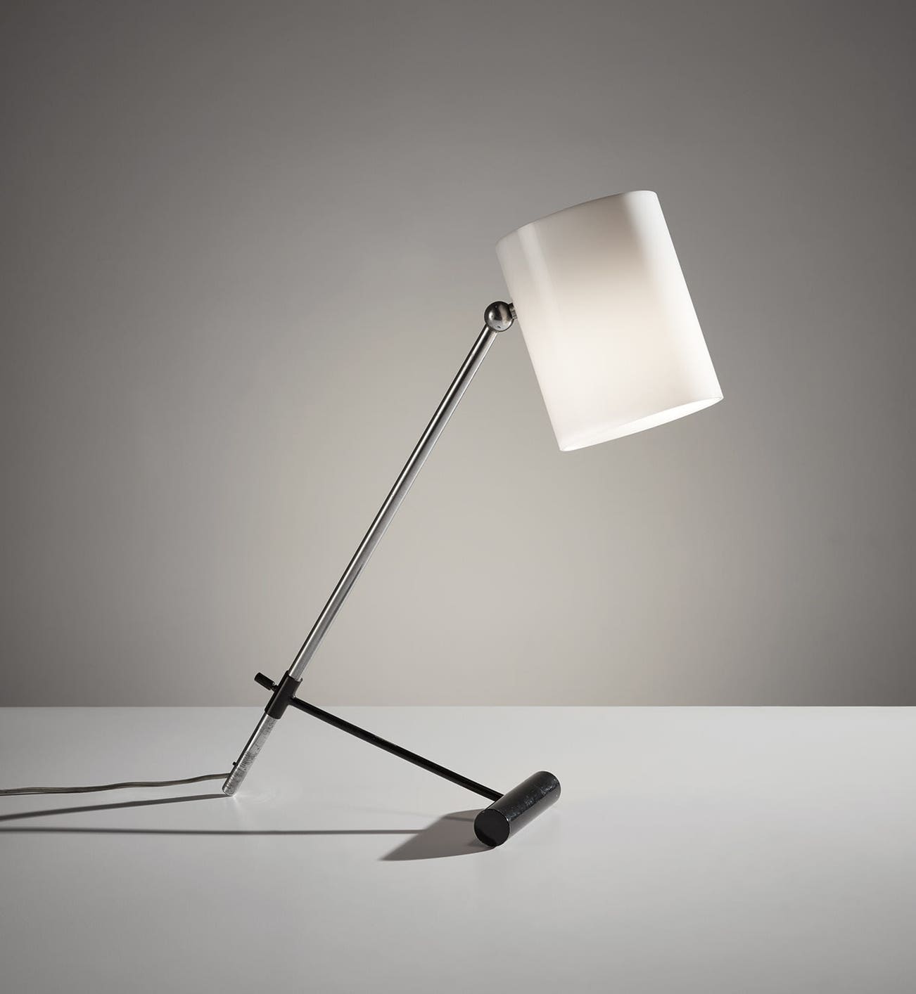 Italian | B. 1912 D. 1985Rising above the devastation of World War II, post-war Italian design reached new heights of productivity and ingenuity, particularly in the realm of lighting. Gino Sarfatti is among the most celebrated lighting designers from this fruitful period. Before founding his company Arteluce in 1939, Sarfatti studied aeronautical engineering. He brought the inventiveness of a self-taught outsider to the field of lighting design, while his mechanical background lent lightness and ingenuity of construction. Poetic underpinnings are also evident in lamps such as model no. 1034 (sometimes referred to as the "Vine" lamp), which features a nearly 8' twisting brass stem graced with nine delicate, articulating white shades like buds on a flower.