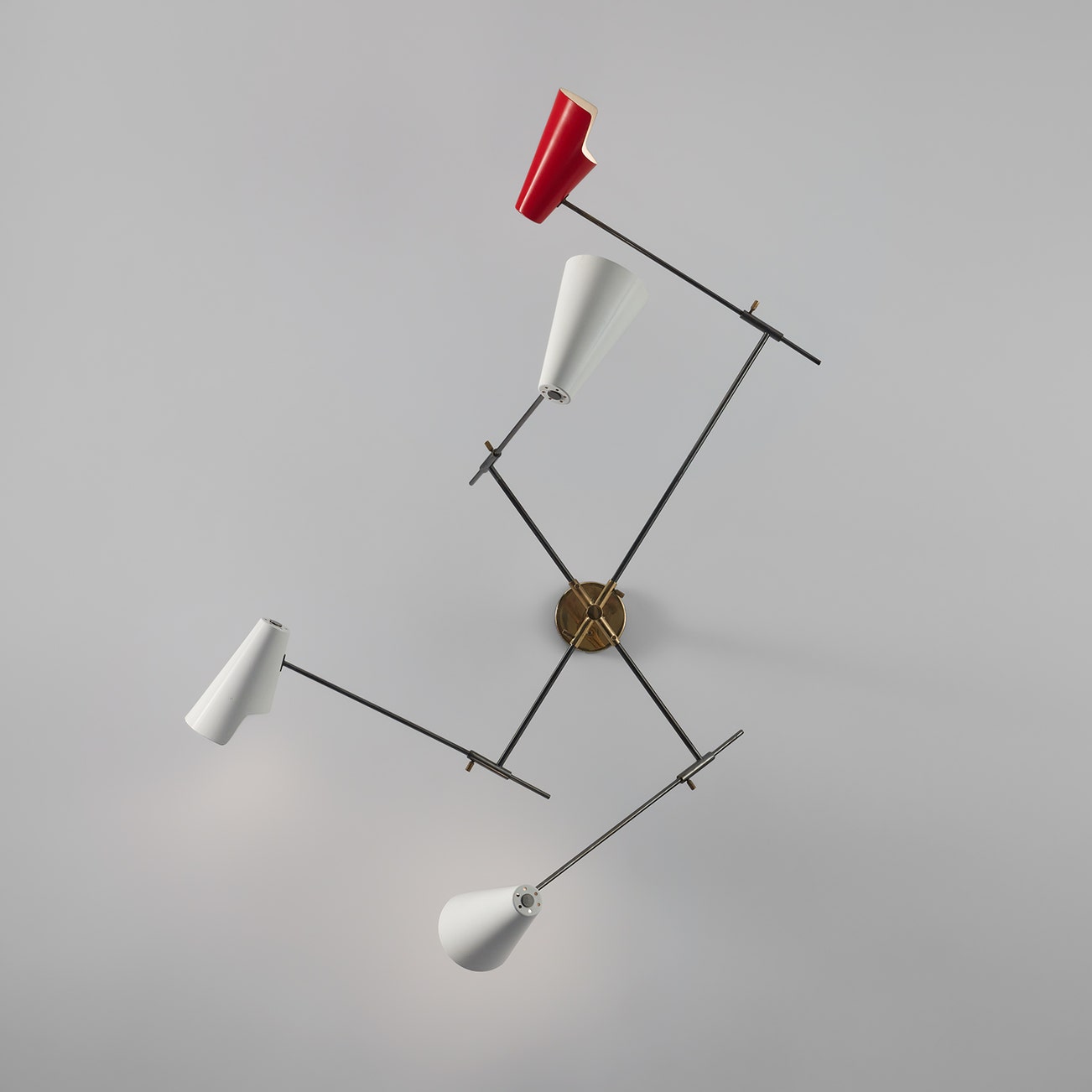 Italian | B. 1912 D. 1985Rising above the devastation of World War II, post-war Italian design reached new heights of productivity and ingenuity, particularly in the realm of lighting. Gino Sarfatti is among the most celebrated lighting designers from this fruitful period. Before founding his company Arteluce in 1939, Sarfatti studied aeronautical engineering. He brought the inventiveness of a self-taught outsider to the field of lighting design, while his mechanical background lent lightness and ingenuity of construction. Poetic underpinnings are also evident in lamps such as model no. 1034 (sometimes referred to as the "Vine" lamp), which features a nearly 8' twisting brass stem graced with nine delicate, articulating white shades like buds on a flower.