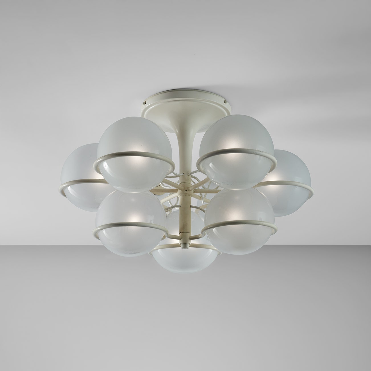 Italian | B. 1912 D. 1985Rising above the devastation of World War II, post-war Italian design reached new heights of productivity and ingenuity, particularly in the realm of lighting. Gino Sarfatti is among the most celebrated lighting designers from this fruitful period. Before founding his company Arteluce in 1939, Sarfatti studied aeronautical engineering. He brought the inventiveness of a self-taught outsider to the field of lighting design, while his mechanical background lent lightness and ingenuity of construction. Poetic underpinnings are also evident in lamps such as model no. 1034 (sometimes referred to as the "Vine" lamp), which features a nearly 8' twisting brass stem graced with nine delicate, articulating white shades like buds on a flower.