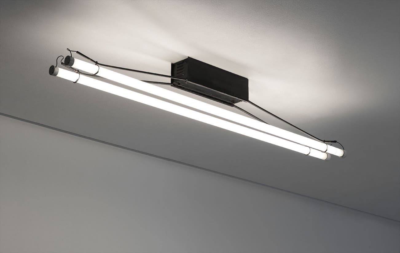 Painted tubular steel, painted metal, two fluorescent bulbs.