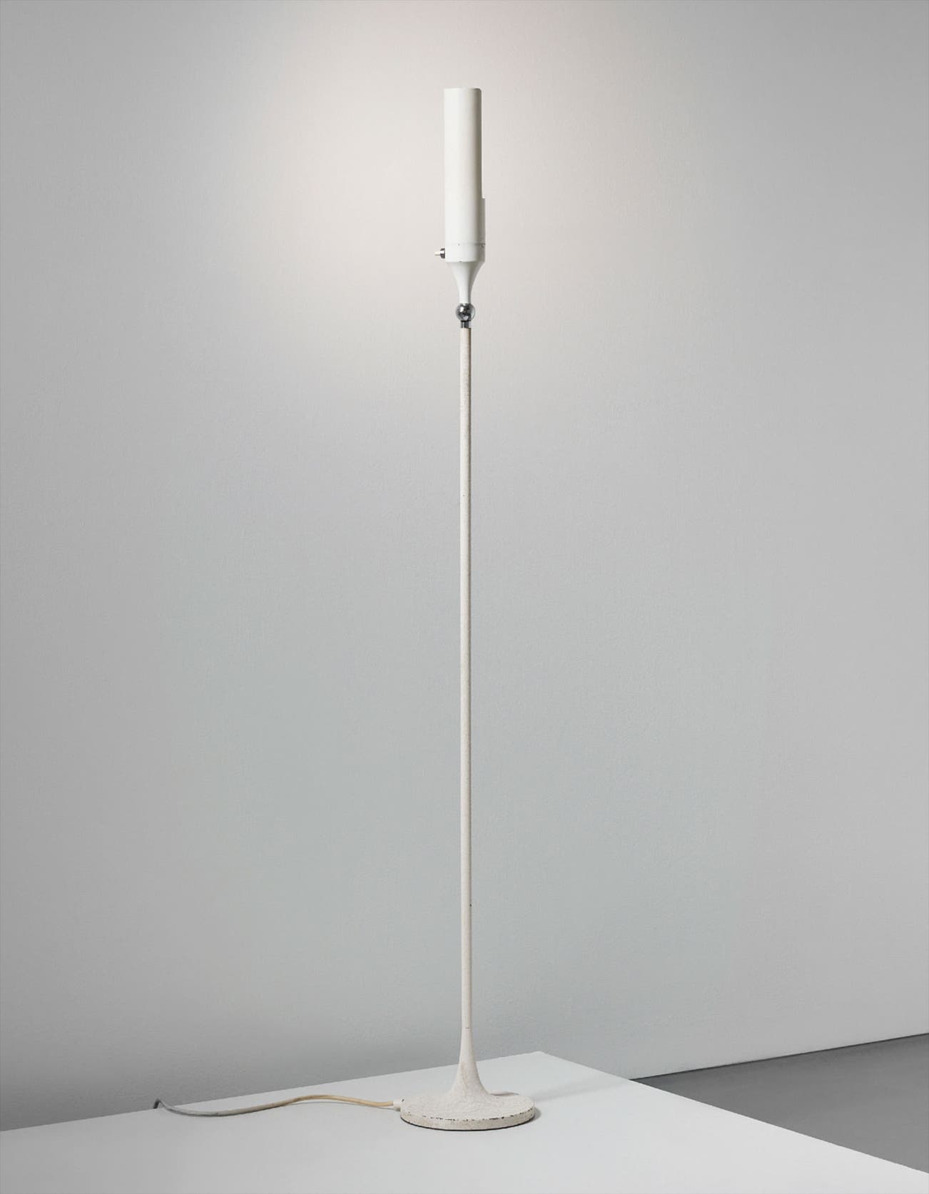 Italian | B. 1912 D. 1985Rising above the devastation of World War II, post-war Italian design reached new heights of productivity and ingenuity, particularly in the realm of lighting. Gino Sarfatti is among the most celebrated lighting designers from this fruitful period. Before founding his company Arteluce in 1939, Sarfatti studied aeronautical engineering. He brought the inventiveness of a self-taught outsider to the field of lighting design, while his mechanical background lent lightness and ingenuity of construction. Poetic underpinnings are also evident in lamps such as model no. 1034 (sometimes referred to as the "Vine" lamp), which features a nearly 8' twisting brass stem graced with nine delicate, articulating white shades like buds on a flower.