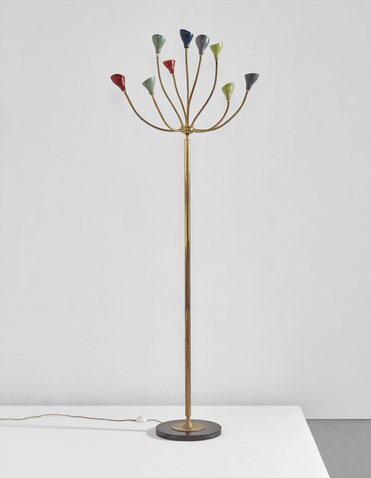 Italian | B. 1912 D. 1985Rising above the devastation of World War II, post-war Italian design reached new heights of productivity and ingenuity, particularly in the realm of lighting. Gino Sarfatti is among the most celebrated lighting designers from this fruitful period. Before founding his company Arteluce in 1939, Sarfatti studied aeronautical engineering. He brought the inventiveness of a self-taught outsider to the field of lighting design, while his mechanical background lent lightness and ingenuity of construction. Poetic underpinnings are also evident in lamps such as model no. 1034 (sometimes referred to as the "Vine" lamp), which features a nearly 8' twisting brass stem graced with nine delicate, articulating white shades like buds on a flower.