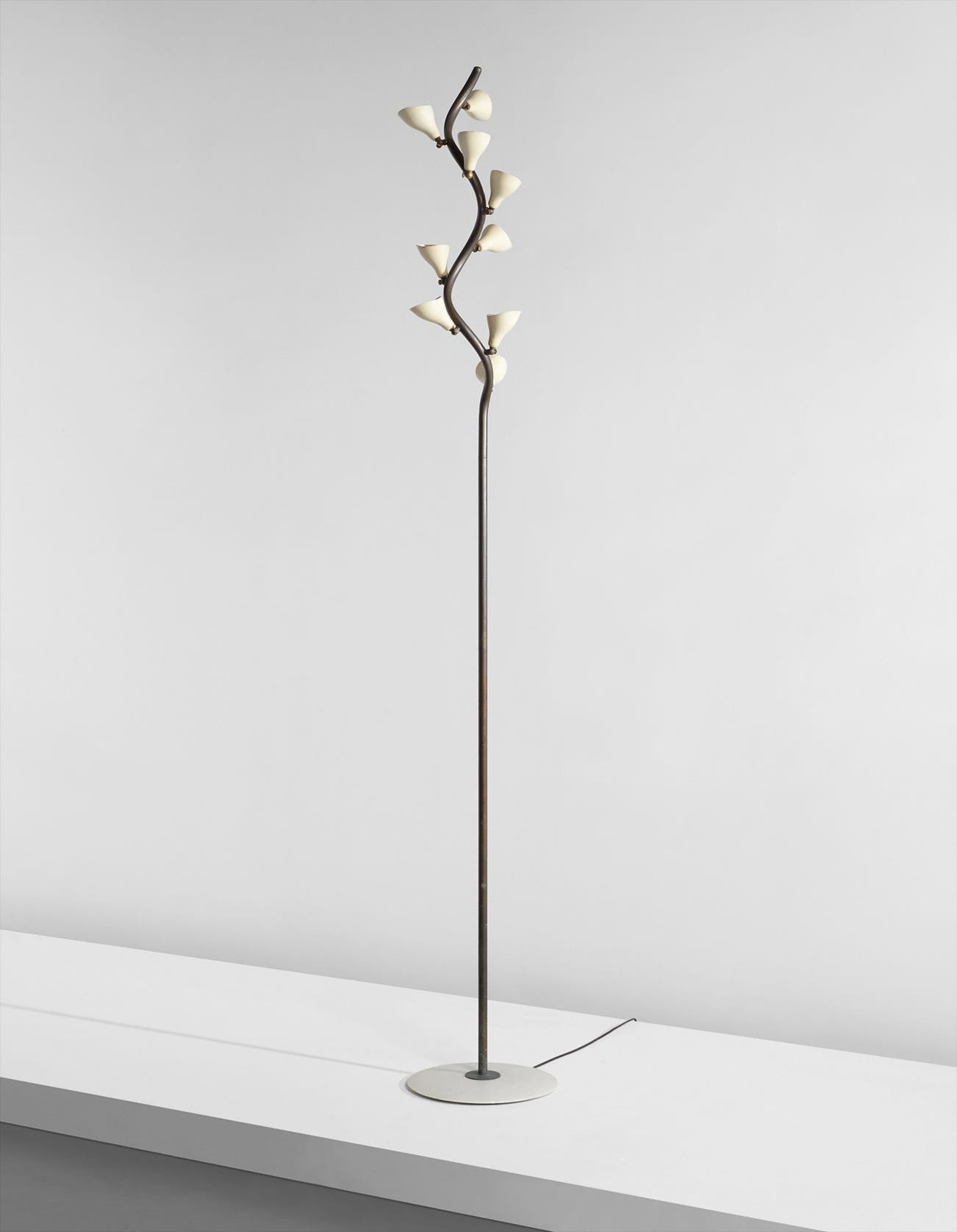 Italian | B. 1912 D. 1985Rising above the devastation of World War II, post-war Italian design reached new heights of productivity and ingenuity, particularly in the realm of lighting. Gino Sarfatti is among the most celebrated lighting designers from this fruitful period. Before founding his company Arteluce in 1939, Sarfatti studied aeronautical engineering. He brought the inventiveness of a self-taught outsider to the field of lighting design, while his mechanical background lent lightness and ingenuity of construction. Poetic underpinnings are also evident in lamps such as model no. 1034 (sometimes referred to as the "Vine" lamp), which features a nearly 8' twisting brass stem graced with nine delicate, articulating white shades like buds on a flower.