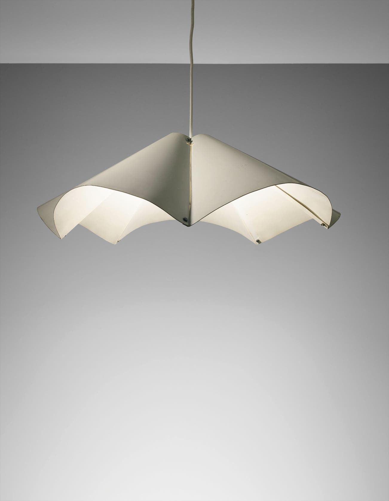 Italian | B. 1912 D. 1985Rising above the devastation of World War II, post-war Italian design reached new heights of productivity and ingenuity, particularly in the realm of lighting. Gino Sarfatti is among the most celebrated lighting designers from this fruitful period. Before founding his company Arteluce in 1939, Sarfatti studied aeronautical engineering. He brought the inventiveness of a self-taught outsider to the field of lighting design, while his mechanical background lent lightness and ingenuity of construction. Poetic underpinnings are also evident in lamps such as model no. 1034 (sometimes referred to as the "Vine" lamp), which features a nearly 8' twisting brass stem graced with nine delicate, articulating white shades like buds on a flower.