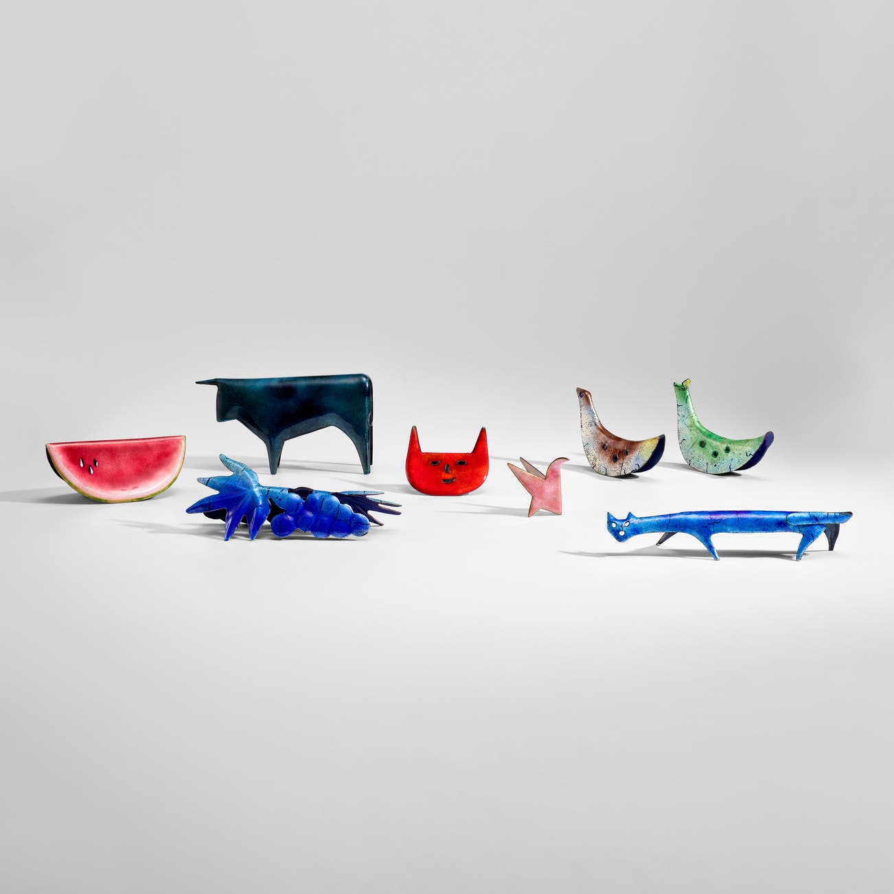 Produced by Smalti de Poli, Padua, Italy. Underside of 'Gatto' incised De Poli and with paper label printed SMALTI/DE POLI/35139 PADOVA/VIA S. PIETRO, 43/ITALIA and 'GATTO' DI GIO PONTI. Reverse of 'Diavolo' incised De Poli and with paper label printed SMALTI/DE POLI/35139 PADOVA/VIA S. PIETRO, 43/ITALIA. Underside of 'Toro' incised De Poli. Underside of 'Anguria' incised De Poli and with paper label printed PAOLO DE POLI/VIA S. PIETRO, 43/TELEF. (049) 8751117/35139 PADOVA - ITALIA. Underside of 'Grappolo d'uva' incised De Poli. Underside of both 'Colombine' incised De Poli and with retailer's paper labels. Reverse of 'Uccello' incised De Poli.