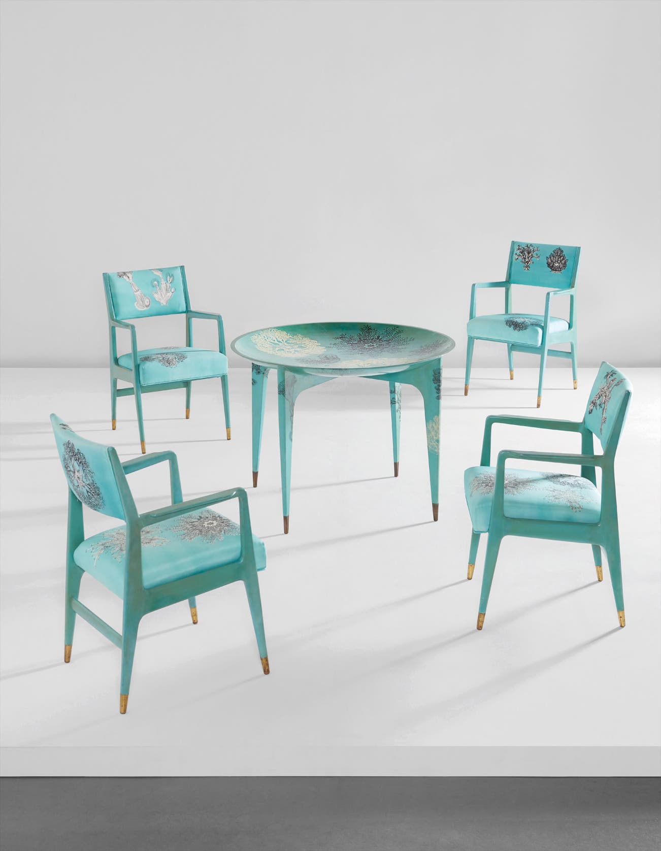 Designed by Ponti, made by the master cabinetmaker, Giordano Chiesa, and decorated by Fornasetti, the rare “Madrepore” dining table and four armchairs are an outstanding example of their highly successful collaboration. The elegant proportions of the wood table, its slender, elongated legs, and brass sabots are characteristic features of Ponti’s furniture designs. Typical of Fornasetti’s decorative approach, he applied lithographic prints to the brightly painted surfaces of the furniture. In this instance, he scattered large black and white images of different varieties of stony coral (madrepore in Italian) over the top, sides, and legs of the table. Silhouetted against the deeply saturated turquoise background, the decoration brings to mind the coral reefs found in the coastal waters of tropical islands. The wonderfully imaginative theme of the ensemble is further enhanced by the fact that the top of the table is concave and covered with glass, thereby creating the illusion of a tidal pool.