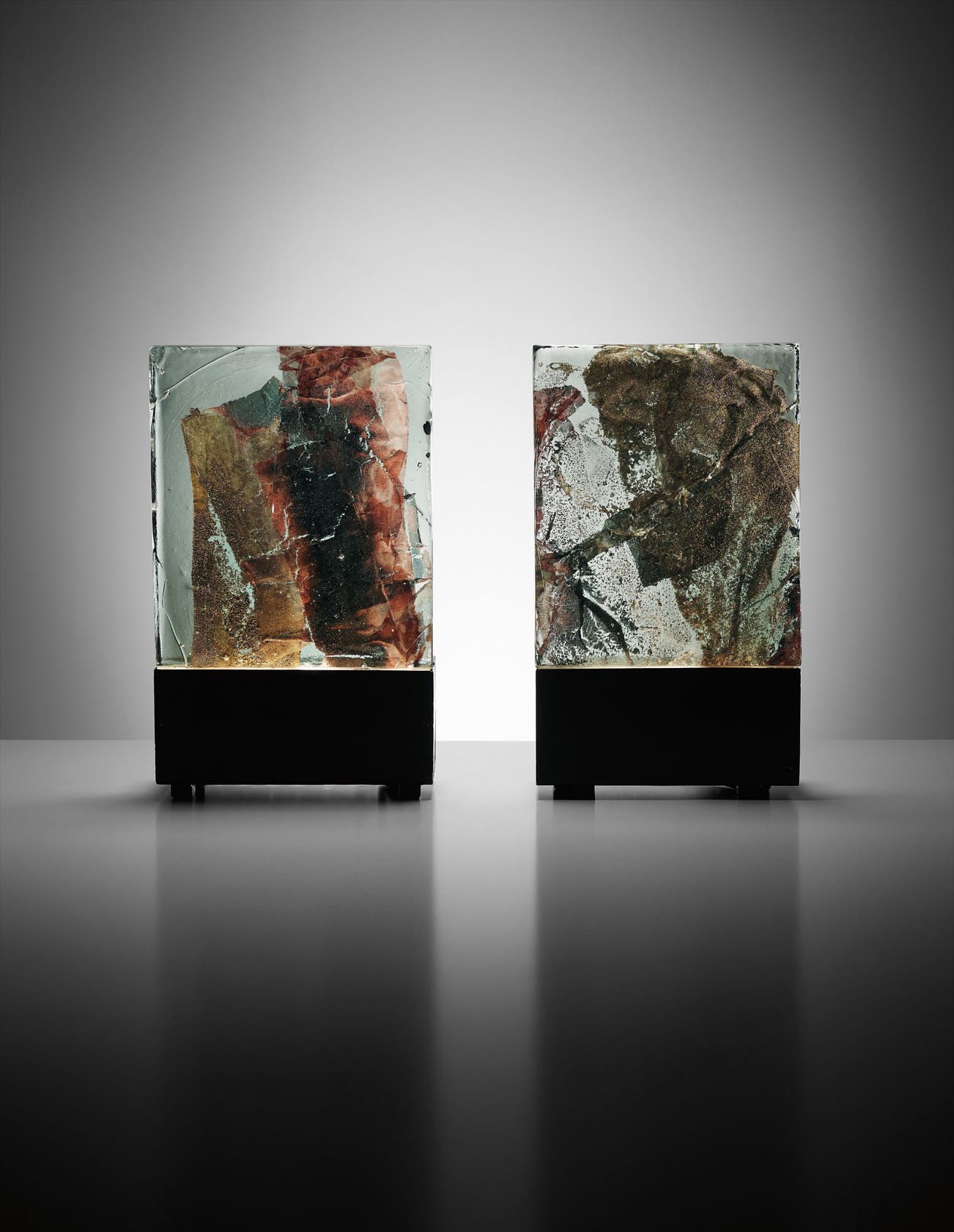 Two illuminated 'Vetrate Grosse' glass blocks, designed for the windows of San Carlo's Church, Milan