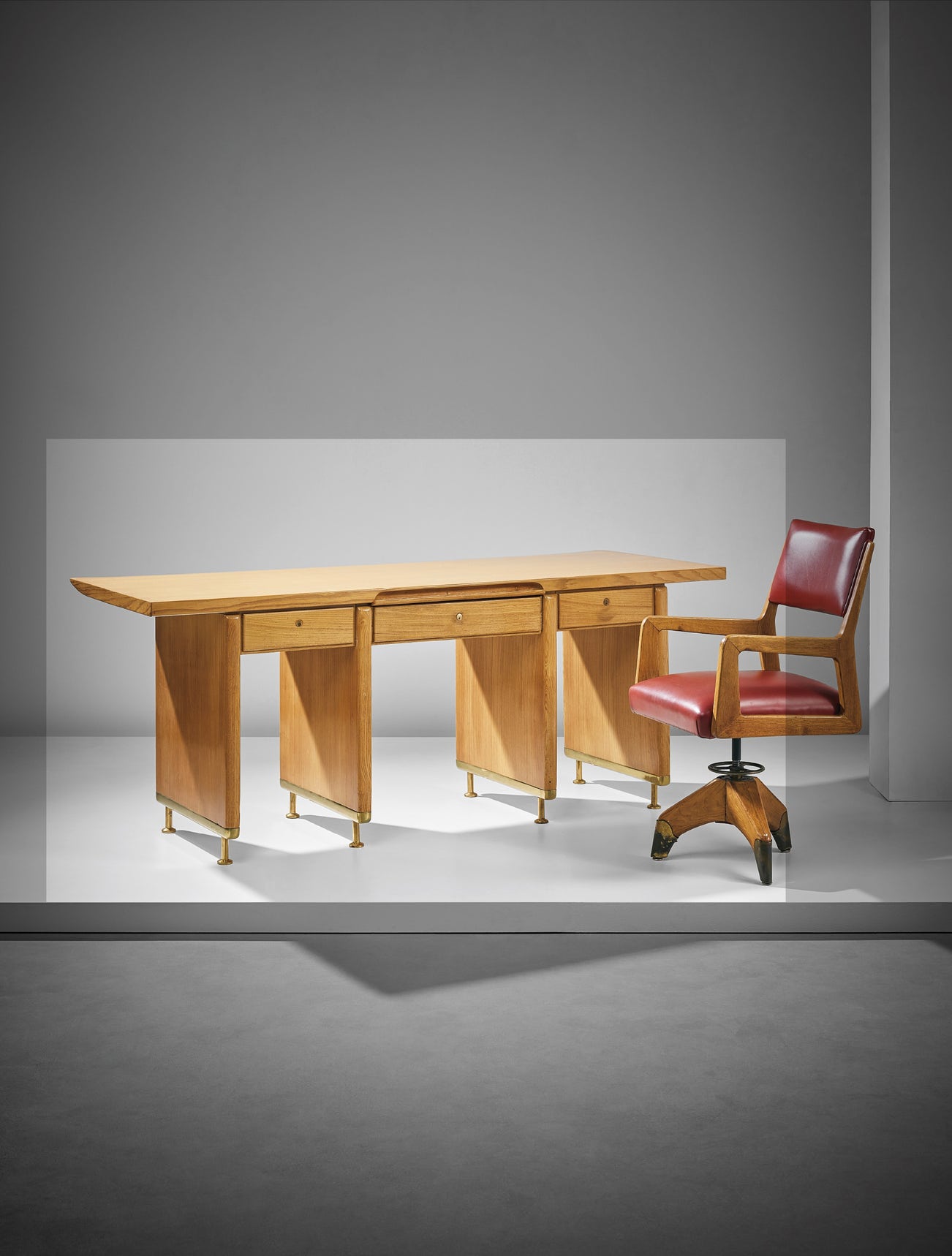 The executive desk and the ‘organised wall’, excluding the hinged semi-movable furniture designed for the Dulciora offices which we are offering at auction represent a slightly simplified version of the projects published in Domus, and were likely used to decorate the secondary offices. A unique set of chairs and an exquisite folding table, inspired by a design developed for Beltrami in the 1930s and which would become a distinctive trait of Ponti’s 1950s works, complete the series of furniture.