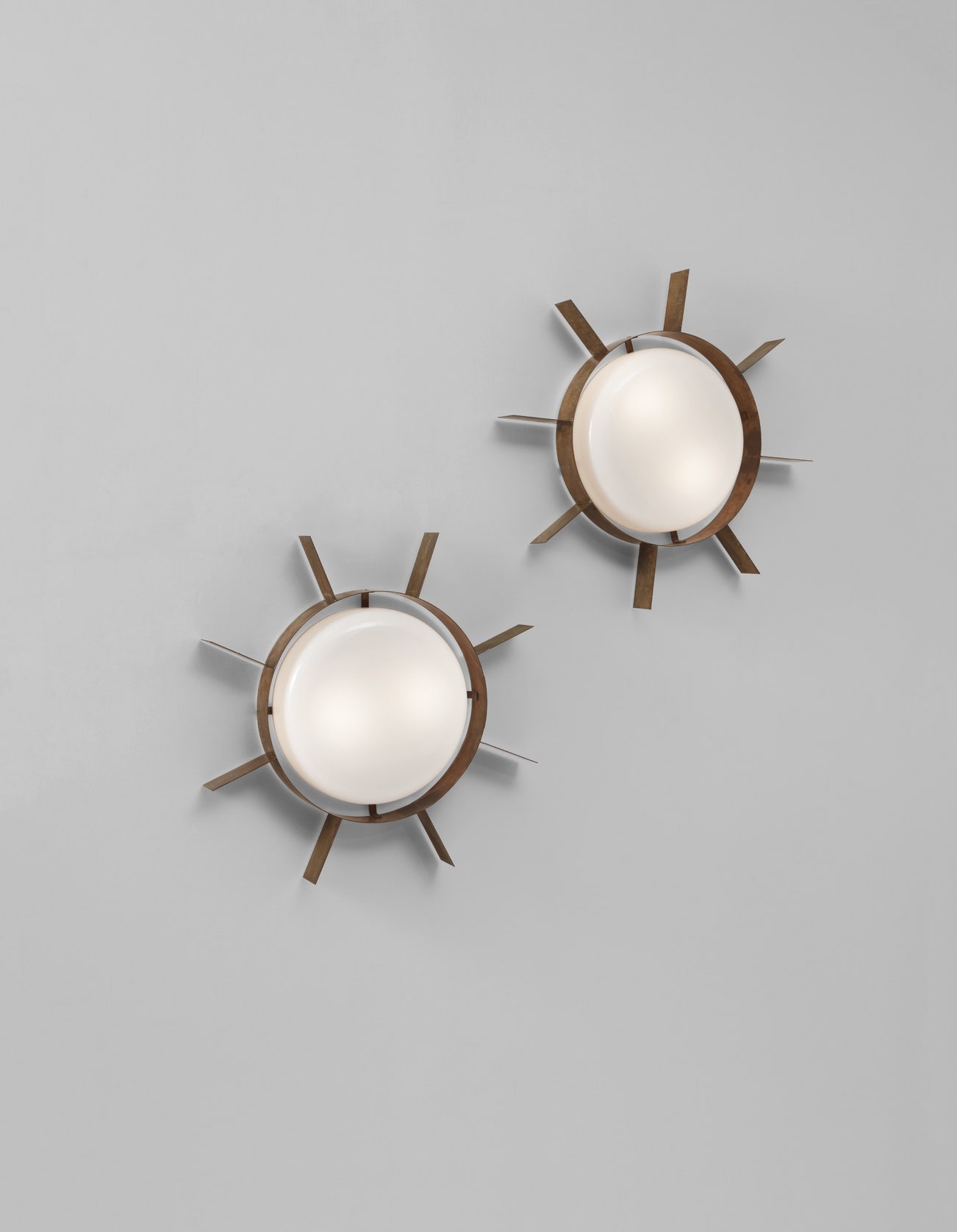 The "Il Sole" light was originally designed by Gio Ponti for the interior of the Istituto Gallini in Voghera, Italy (1956-1962). Though originally conceived as a ceiling light and fitted with a circular fluorescent bulb, the present model is a wall-hanging variant fitted with incandescent bulbs, which cast a warmer light more suitable to domestic interiors.