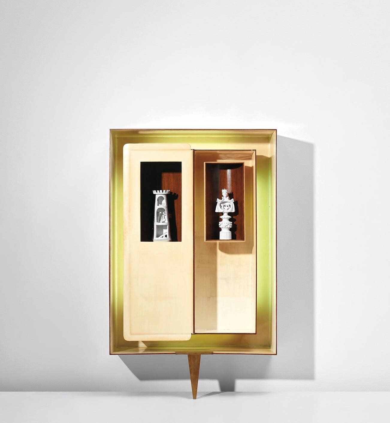 Illuminated 'Positivo-negativo' wall-mounted cabinet with tower and queen statuettes