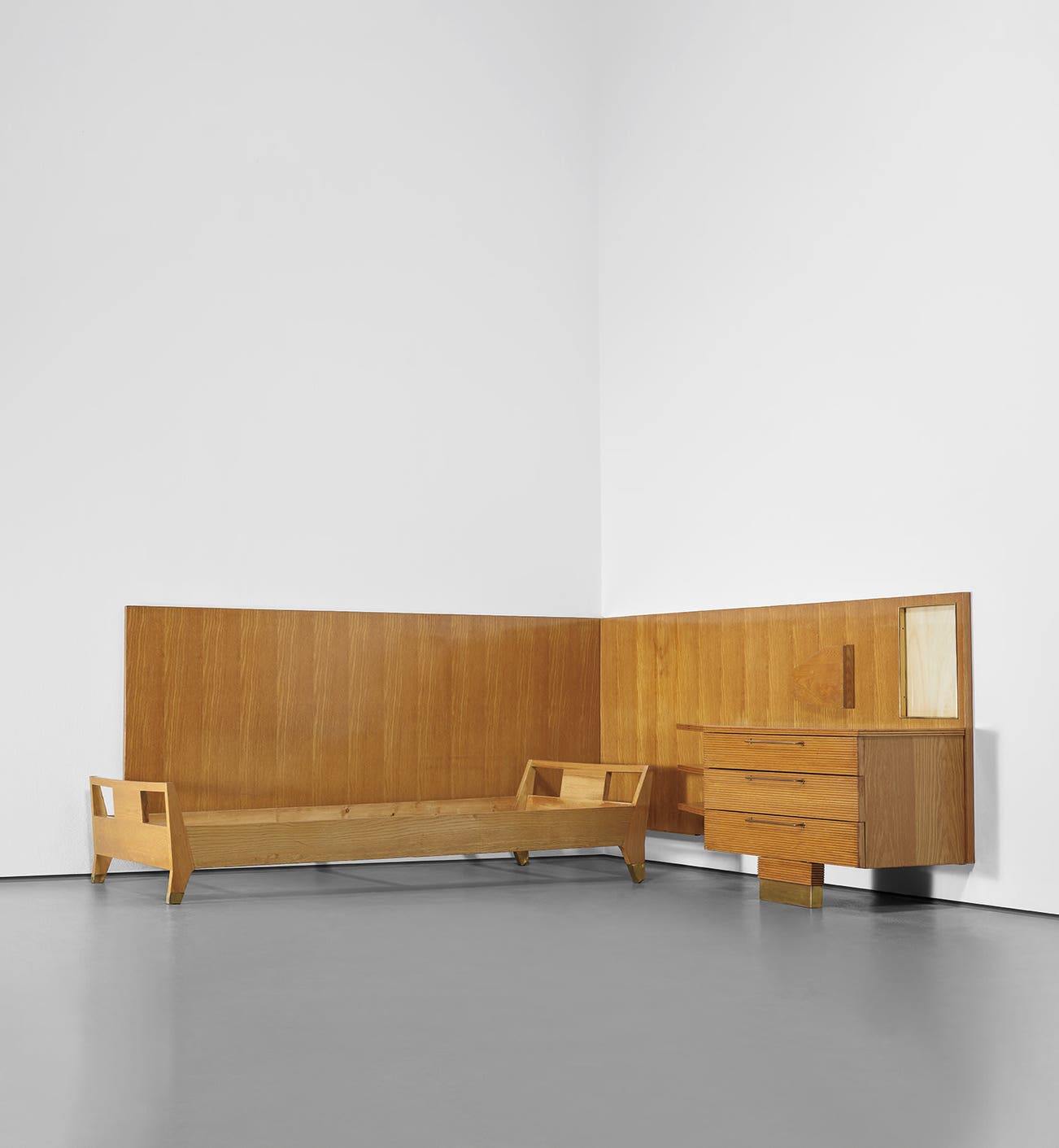 A rare occurrence but no anomaly, the present bedroom suite is an autonomous single commission that does not quite conform to Gio Ponti’s well known preference for total control of an entire project, where he designs a commercial, devotional or residential building and all of its contents from top to bottom. Nevertheless, in this private commission he demonstrates a wide panoply of original spatial solutions that combines structural mastery with a seductive manipulation of materials. The scheme is an adroit juxtaposition of three distinct units, pared down into elegantly functional elements adapted to the needs of everyday life.