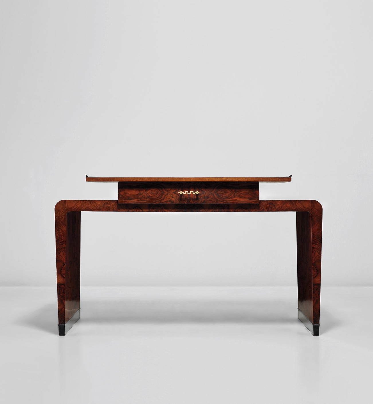 Designed during the 1930s for a private commission, the first desk (lot xx), executed in highly figured curl walnut veneer with painted wood and brass details, illustrates Ponti's finely crafted, luxury furniture for the upper-middle class home. The elegant form of the desk, in which the legs extend beyond the surface of the tabletop, suggest a spacious original setting. The desk recalls Ponti’s earlier neoclassical designs of the 1920s, which were often executed using precious woods and metals with an emphasis on decoration, but in the present work has already become simplified in form.