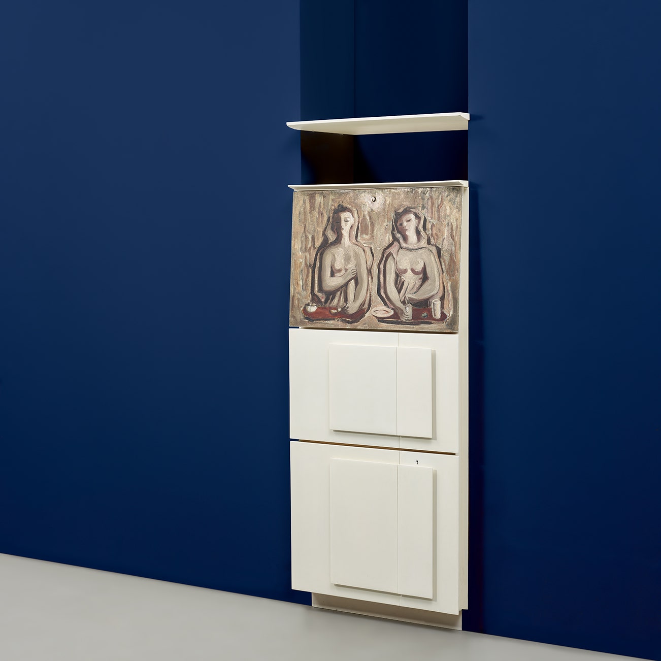 Unique inset drinks cabinet with integrated 'Le bariste' painting and shelf