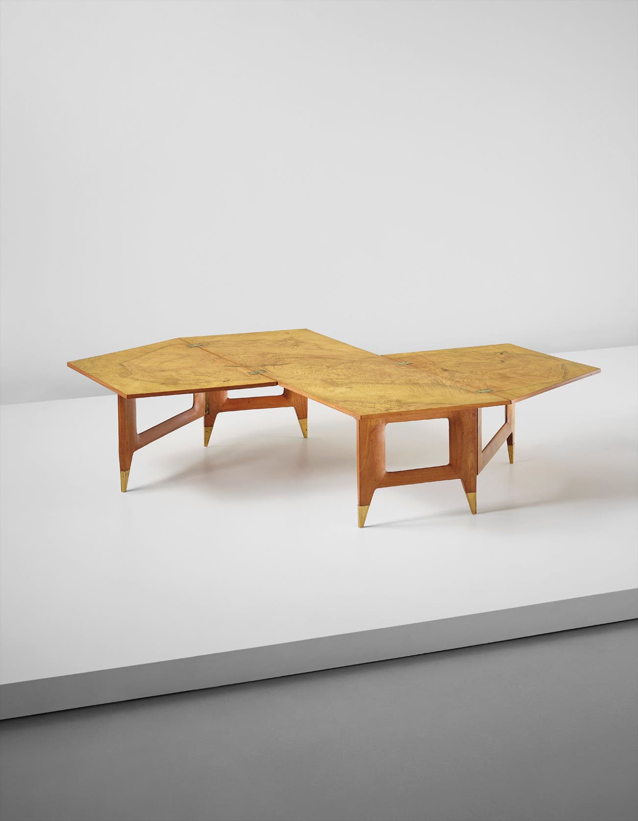 Lot 5, designed in 1937, shows the classical, yet playful design vocabulary of Ponti’s earlier furniture. The following in chronological order is lot 6, a set of three tables from 1948. It takes a traditional material, marble, and gives it an unconventional, modern form, breaking it up into sections that can function together as a single table, or separately as end tables. It was indicative of a larger trend towards multi – purpose furniture – for example, a 1955 Domus article published the same modular tables across from Osvaldo Borsani’s folding sofa for Tecno. Continuing with the theme of convertible furniture, Ponti designed lot 7 with folding wings. The adaptable design is luxurious in its use of rich, burled veneers, yet playful and unconventional, inviting interaction with the user. As Ponti wrote, “Some enjoyment is not to be excluded in furnishings; it is an ancient tradition.”