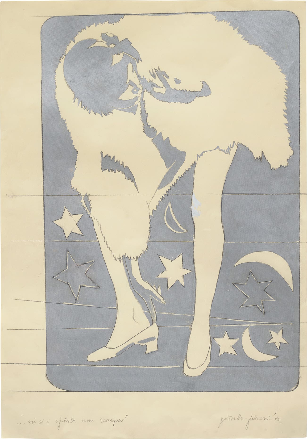 signed and dated ‘giosetta fioroni ‘70’ lower right; titled ‘“.... mi si è sfilata una scarpa”’ lower left