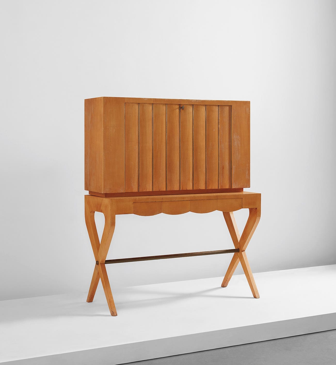 Maple-veneered wood, brass, glass.