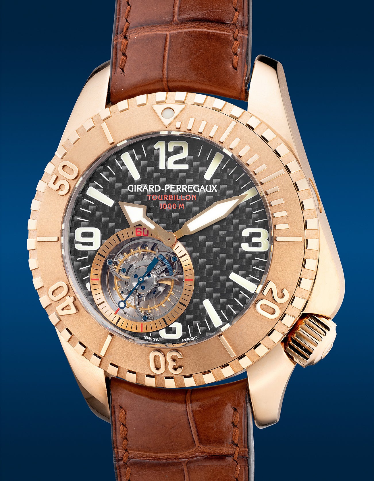 A fine and attractive limited edition pink gold diver’s wristwatch with flying tourbillon escapement, dual gas escape valves, carbon fibre dial with certificate and presentation box, numbered 14 of a limited edition of 32 pieces