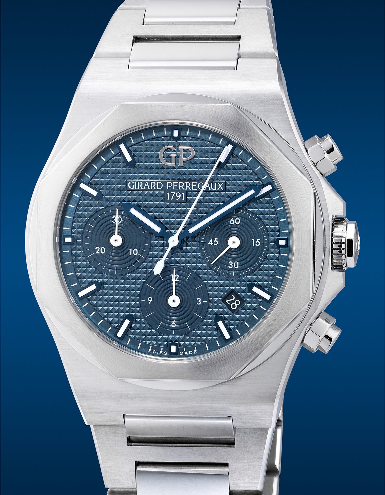 The present example Laureato Chronograph measuring 42mm in diameter is a modern interpretation featuring a stainless steel case and a bracelet. Exuding a sporty appeal, the case is complimented further by an attractive “clous de paris” textured ocean blue dial. Perfect watch for daily wear, the present example is offered in “like new” condition and is further accompanied by its full set of accessories.