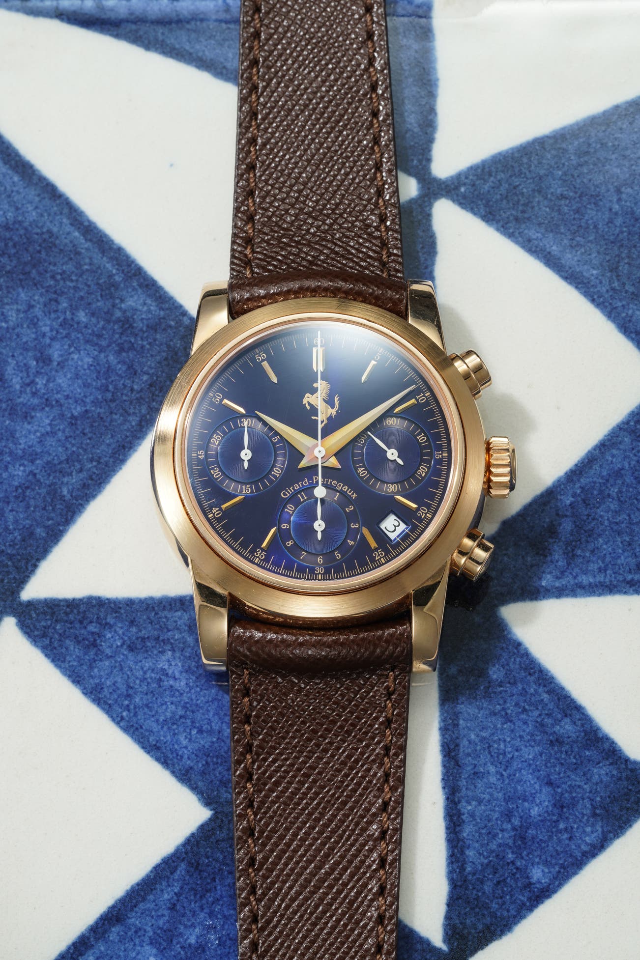 - Their collaboration launched the “Girard Perregaux Pour Ferrari” collection, beginning with the ref. 9015—a self-winding split-seconds gold chronograph limited to 499 pieces, which featured the iconic “Cavallino Rampante.” It quickly sold out, leading to the creation of three more references: 8020 (chronograph), 8025 (time and date), and 8030 (time only), with many variations in metals and Ferrari-themed dial colors.