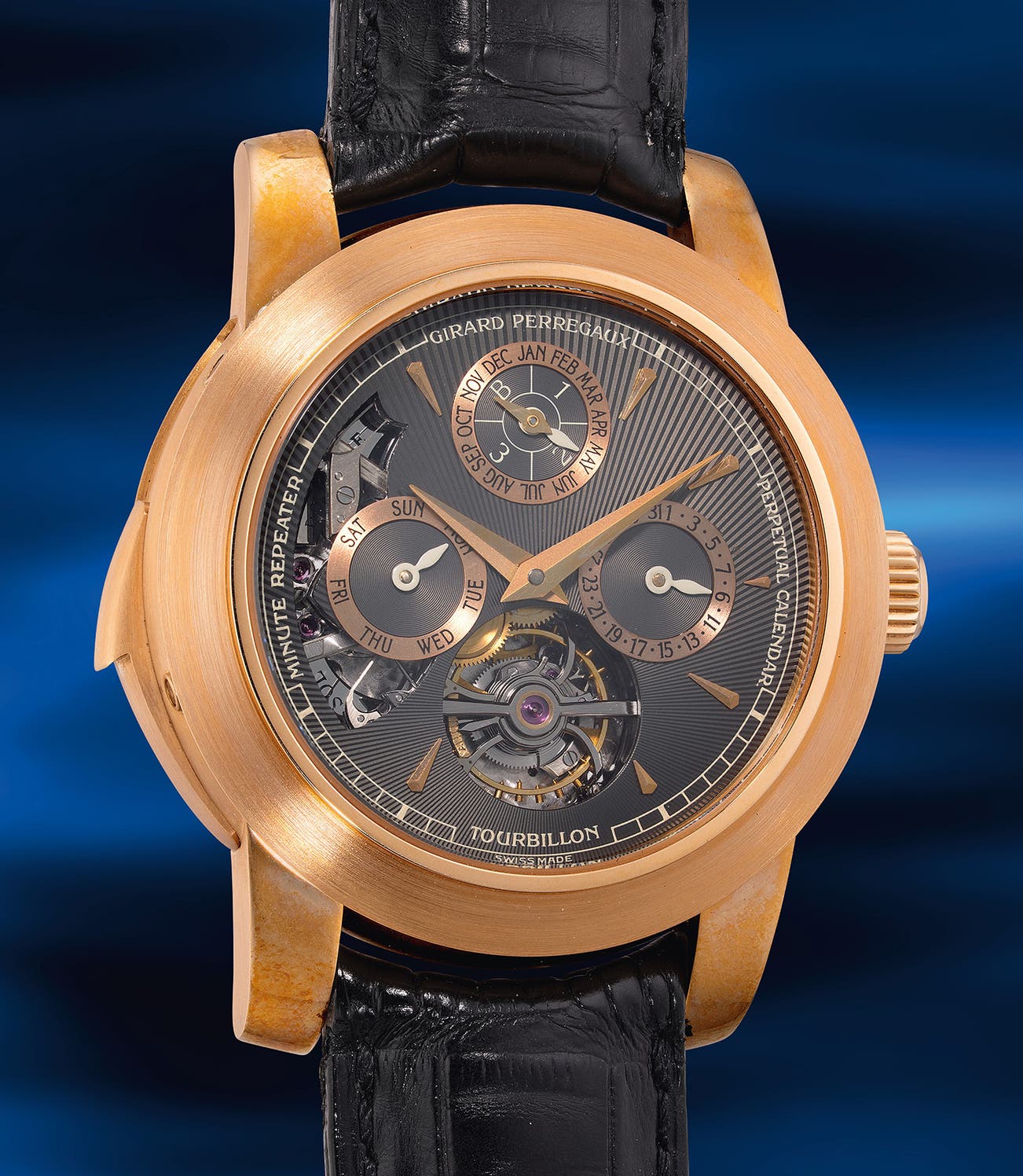 A unique, unworn, extremely fine and important pink gold carillon Westminster minute repeating perpetual calendar tourbillon wristwatch with grey sunburst dial, leap year indication, certificate and presentation box