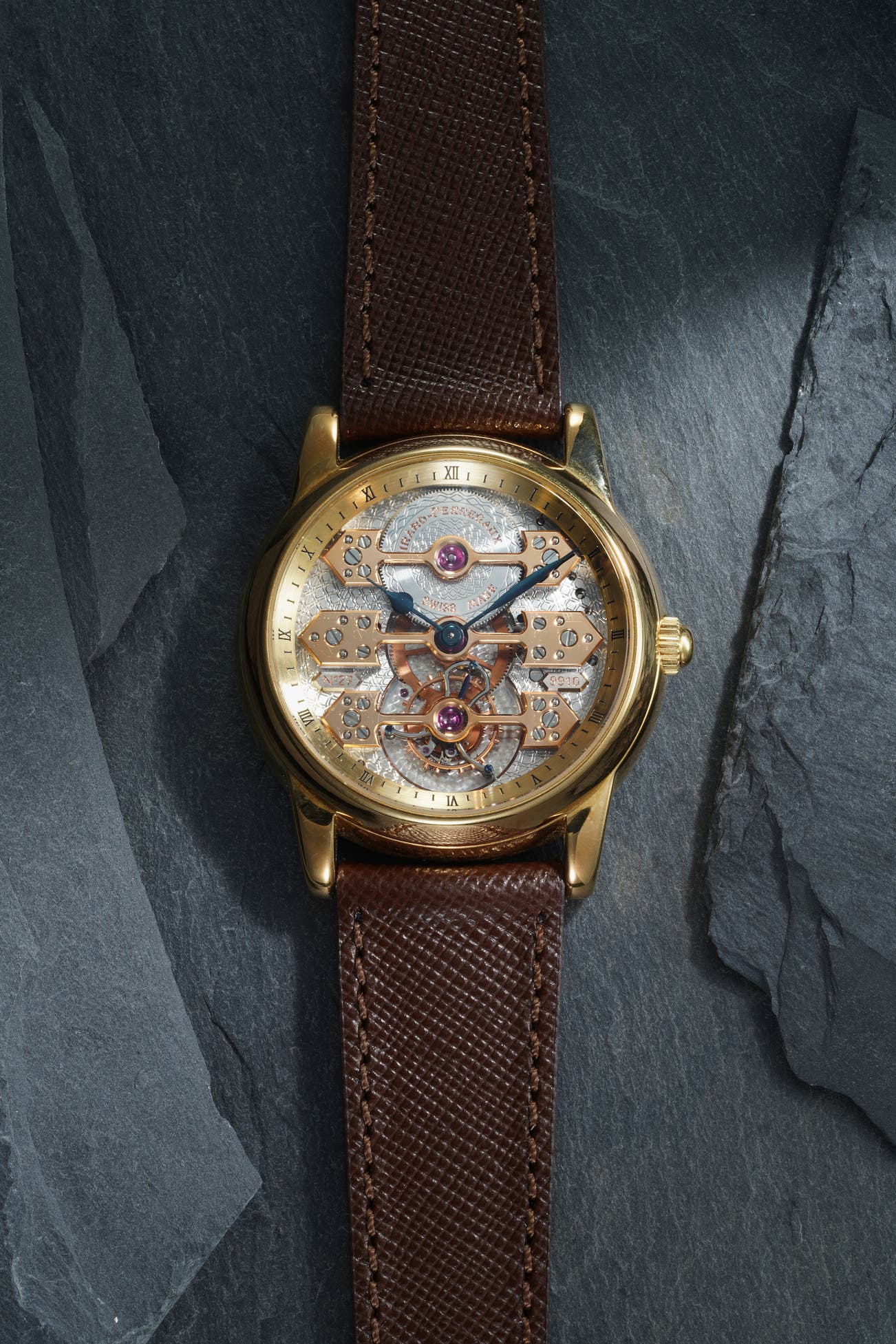 A very fine and attractive yellow gold tourbillon wristwatch with three gold bridges movement