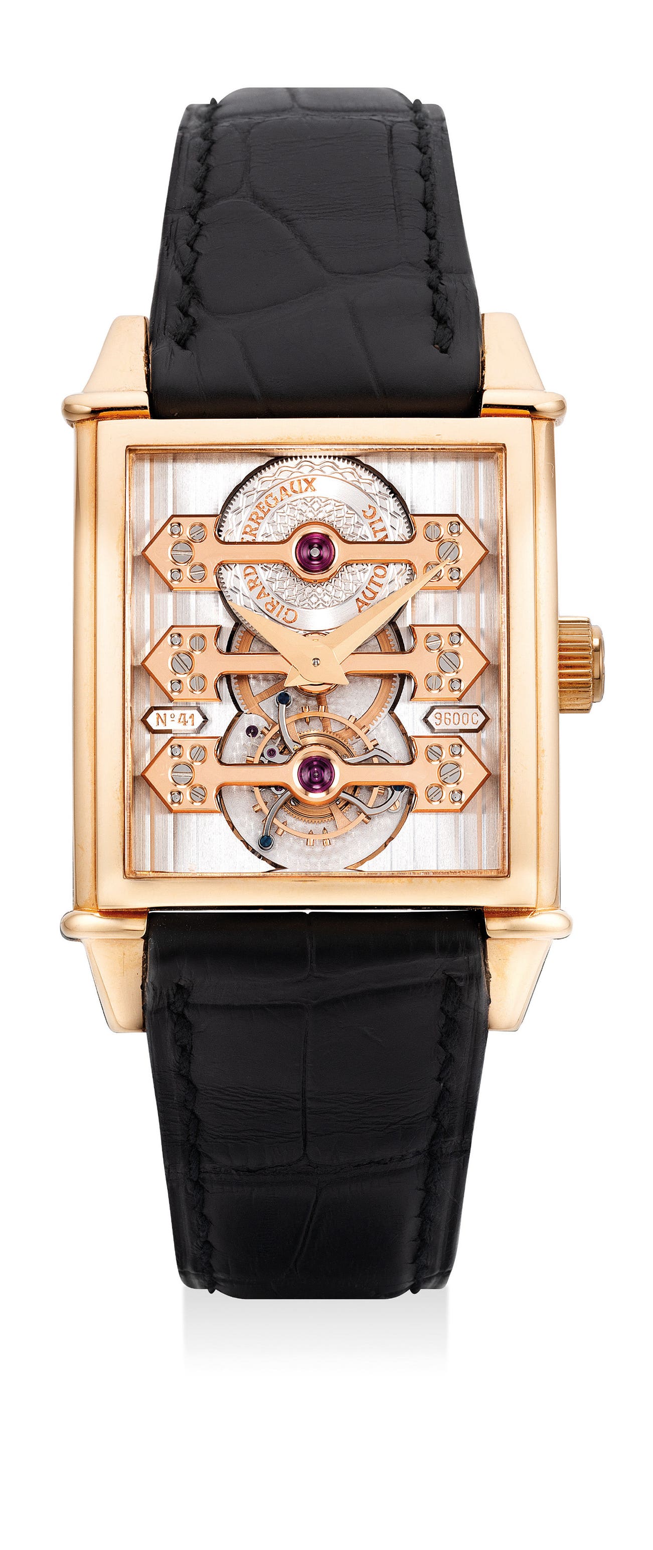 A very fine and attractive pink gold rectangular-shaped wristwatch with tourbillon regulator, three gold bridges movement, certificate and presentation box