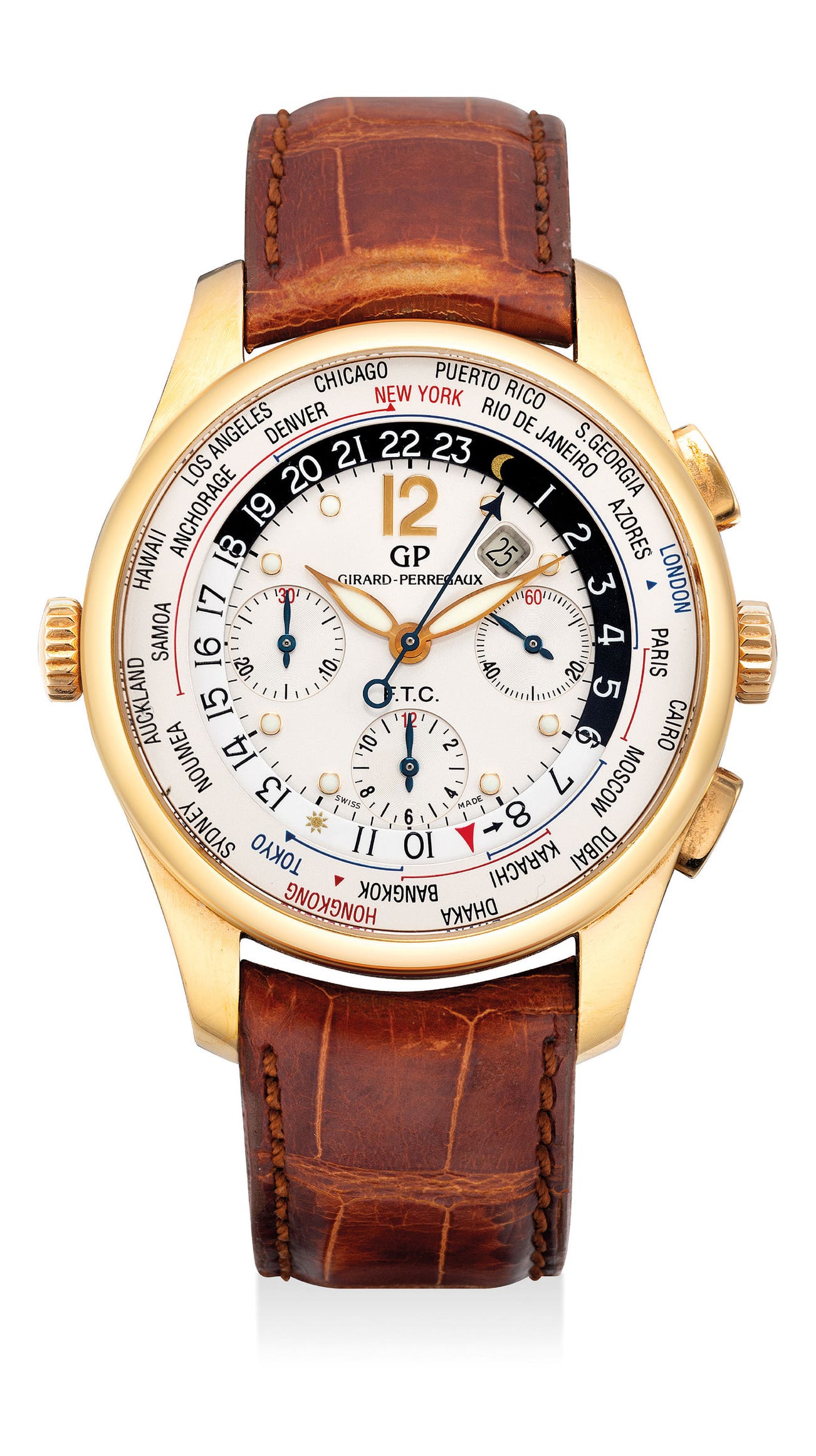 The present watch is a Girard-Perregaux world time chronograph wristwatch introduced in circa 2000. The world time is a phenomenally practical complication indicated by an inner rotating bezel featuring 24 different cities with the corresponding time zone. Furthermore, the watch is chronographic and enables the wearer to start, stop and reset. The watch is complete with practical complication for the explorers and jetsetters of the world.