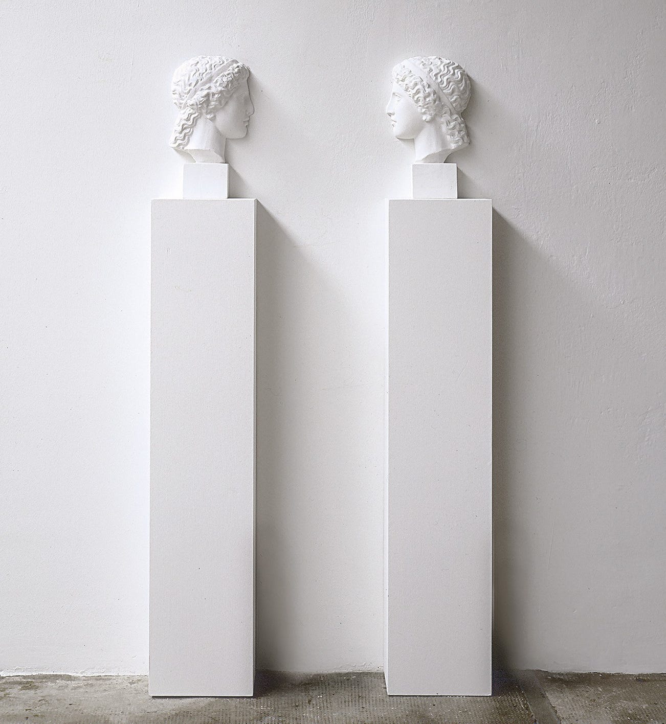 Two halves of a plaster bust on two white painted wooden pedestals, to be installed facing each other, spaced 35 cm apart.