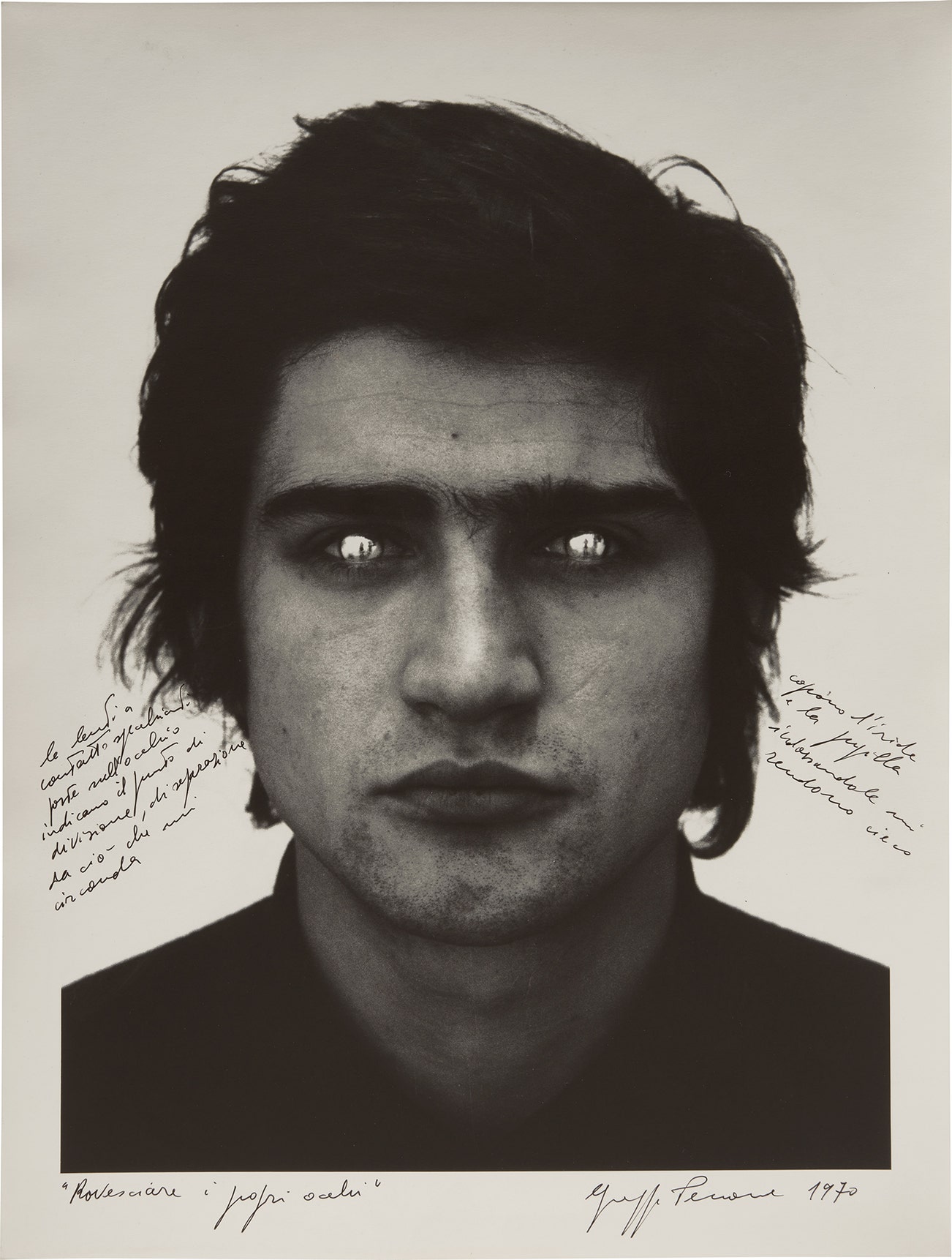 signed, titled, indistinctly inscribed and dated "le lenti [...] "Rovesciare i propri occhi" Guiseppe Penone 1970" on the lower quadrants; stamped with a Paolo Mussat Sartor copyright stamp on the reverse