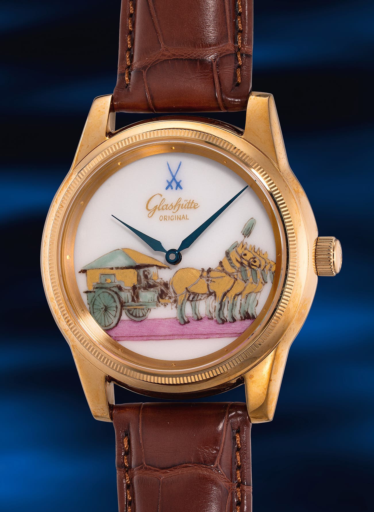 Established in 1845, Glashütte is renowned for its functionality and is one of the most reputable watchmakers in Saxony. The present timepiece is an exceptionally rare creation by the manufacturer as it features a hand-painted porcelain dial of remarkable craftsmanship by Meissen, one of Europe’s most storied ateliers founded in Germany in 1708. Created entirely from porcelain, the dial preserves the noble characteristics of the material—its ivory whiteness, translucency, and lustrous glaze—while meeting the stringent demands of fine watchmaking.