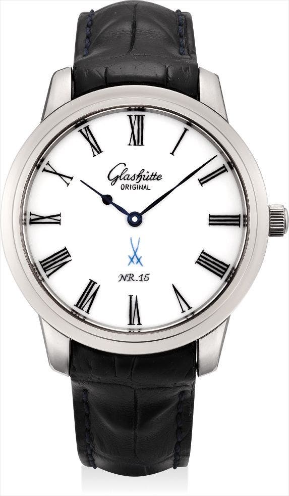 This classic looking white gold wristwatch is crafted with a delicate Meissen porcelain dial and is one of Glashütte Original's trademark collection. The porcelain dial is finely decorated with hand-painted signature, Meissen crossed swords logo and black Roman numerals. Exquisite skills and craftsmanship is required to precisely paint on this paper-thin dial with fine brushes.