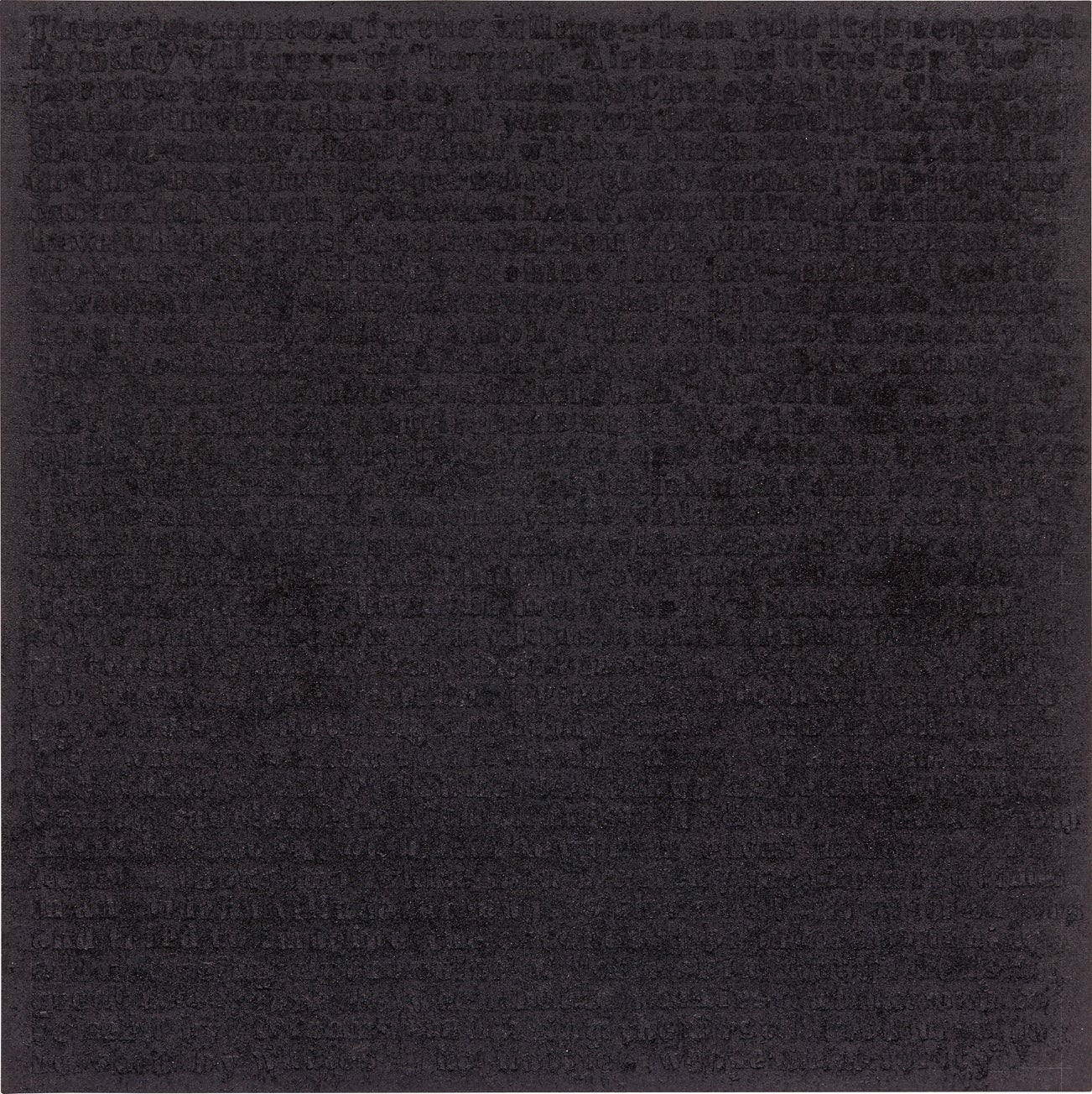 Pulling text from page to canvas, Glenn Ligon's paintings depict stenciled literary fragments in enamel and coal dust as seen in the present lot, a stunning example from his acclaimed Stranger in the Village series. Stranger in the Village written by famed African American novelist, essayist, playwright, and poet, James Baldwin in 1953, describes the author’s experiences as the first black person to enter a small Alpine village in Switzerland. His account is superbly crafted as both a personal narrative and a larger statement on the historical notions of “whiteness” and “blackness”. Baldwin’s words recounting his feelings of personal isolation within this remote mountain village can be vaguely made out in the coal dusted letters of Stranger in the Village #55. Ligon’s black text, applied against a black background, weaves in and out of legibility, visually obscuring our ability to comprehend these written truths of historical and racial identity. The choice of coal dust, as the artist explains, “bumped up the physicality of the text, but at the same time obscured the text…. Coal dust is an interesting material for me because it’s beautiful; it’s a black, shiny material, but it’s also a waste product … leftover from coal processing. I am drawn to it because of all of the contradictory readings it engenders” (Glenn Ligon quoted in Glenn Ligon: stranger, exh. cat., The Studio Museum of Harlem, New York, 2001). Such contradictory meanings oscillate between beauty and waste, mystery and reflection. The result is an illustration of Ligon's perceived negatives in a material that illuminates the viewer’s space, allowing for one’s own interpretation to exist between the lines.