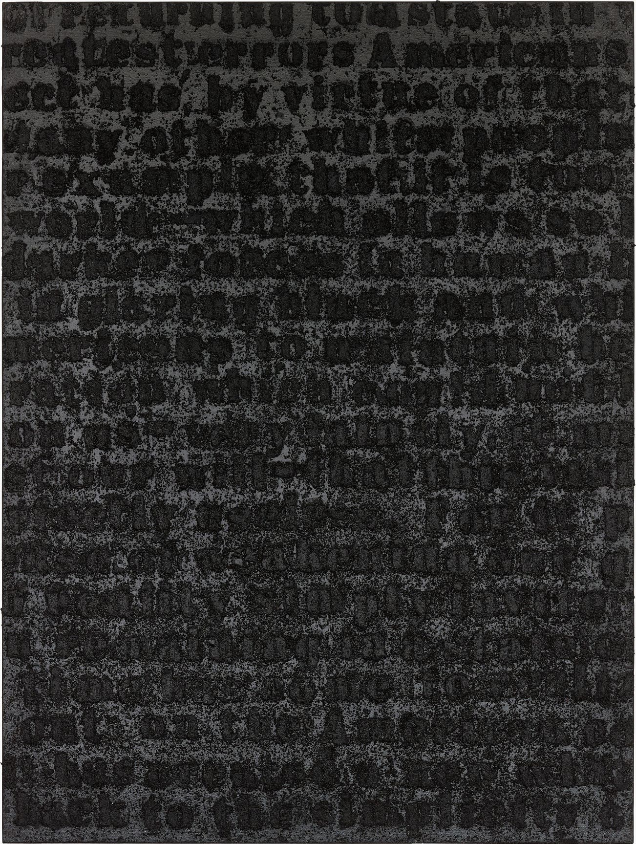 Manifesting itself with an all-encompassing presence, Stranger Study #11 is a quintessential example of Glenn Ligon’s iconic Stranger series. What, at first glance, appears to be a richly textured black monochrome, upon closer inspection reveals itself to be a dense amalgamation of text on the cusp of legibility, its coal powder-dusted surface glimmering seductively as it catches the light. Executed in 2012 in the aftermath of the artist’s important mid-career retrospective at the Whitney Museum, New York, the present work is a continuation of Ligon’s over twenty-year fascination with James Baldwin’s 1955 Stranger in the Village – a semi-autobiographical essay exploring questions of race and history that has provided the basis for Ligon’s Stranger series since its inception in the mid-1990s. Demonstrating Ligon’s acclaimed strategy of pushing appropriated text into abstraction, Stranger Study #11 is the result of the systematic overlaying of stenciled passages from Baldwin’s essay with black oilstick until they coalesce into near illegibility. With other examples of this series prominently housed in such institutions as the Museum of Modern Art, New York, the Walker Art Center, Minneapolis, and the San Francisco Museum of Modern Art, this work is a powerful example of Ligon’s acclaimed conceptual practice.