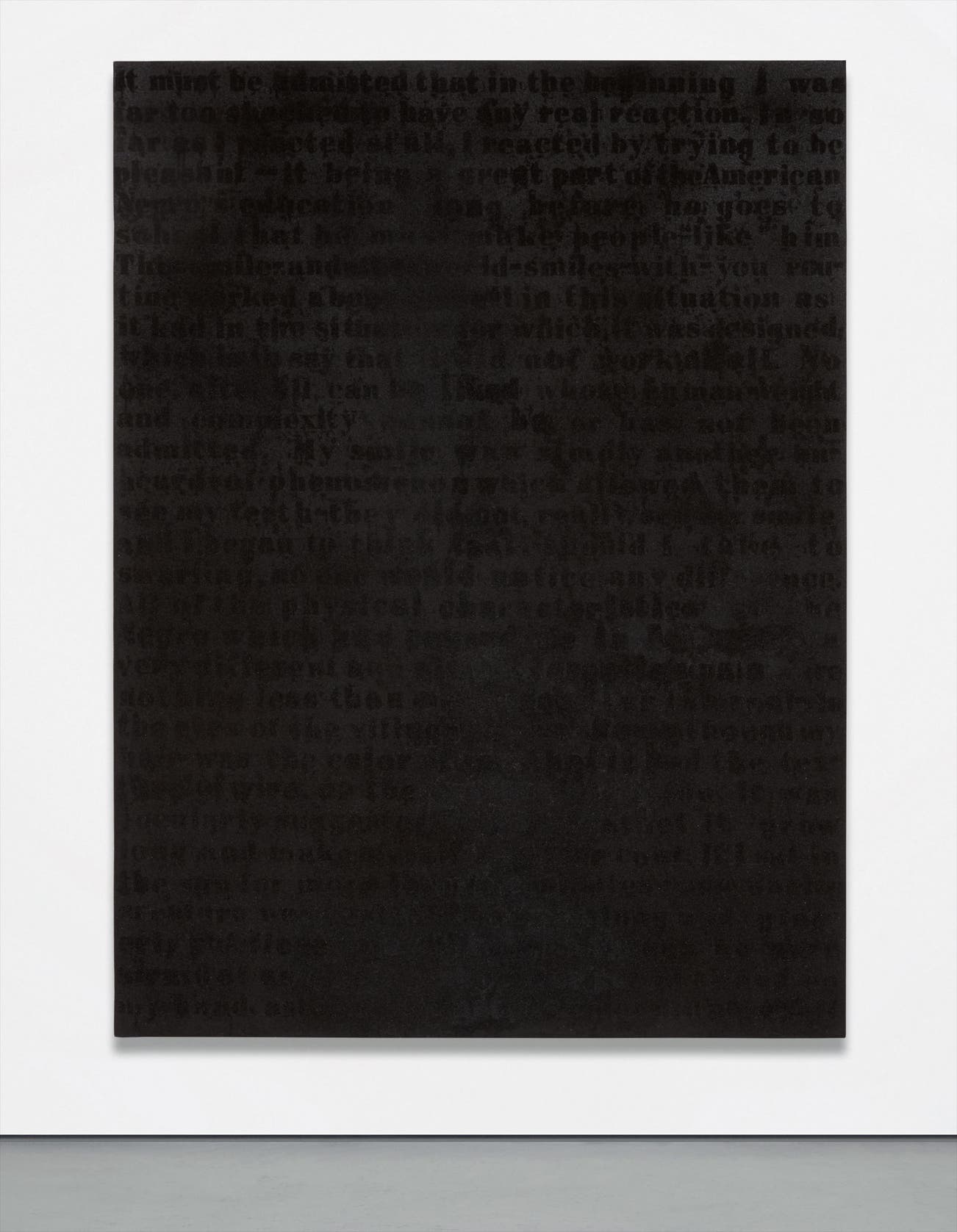Stranger in the Village #11 is immediately illegible, heavy and all-encompassing, inaccessible to our contrast-driven vision. Allowing each word to deteriorate across the horizontal picture plane, Ligon points albeit subtlety to the fact that no matter what elegant string of words may be tied together, it remains utterly impossible to exhaustively describe the human experience. Ligon’s adept use of Appropriations, Conceptualism, and Minimalism enables him to subvert a straightforward categorization. Of his coalescent style, the artist has commented, “The movement of language toward abstraction is a consistent theme in my work. I’m interested in what happens when a text is difficult to read or frustrates legibility—what that says about our ability to think about each other, know each other, process each other.” (Glenn Ligon in Hilarie M. Sheets, “The Writing on The Wall: Glenn Ligon on Borrowing Text to Expose American Racism, in 2011,”ARTNews, January 2016). The present lot utilizes content, form, shape, and language to ignite debates about representation, history and race relationships. Ligon’s use of Baldwin’s text, while seemingly submissive in its obscured presentation, is profoundly resonant in today’s political landscape. Once we parse through the thick layer of dust to grasp the first six lines: “It must be admitted that in the beginning I was far too shocked to have any real reaction. In so far as I reacted at all, I reacted by trying to be pleasant—it being a great part of the American Negro's education (long before he goes to school) that he must make people like him.” (James Baldwin, “STRANGER IN THE VILLAGE,” from Notes of a Native Son, 1955, 1984, pp. 159-75)