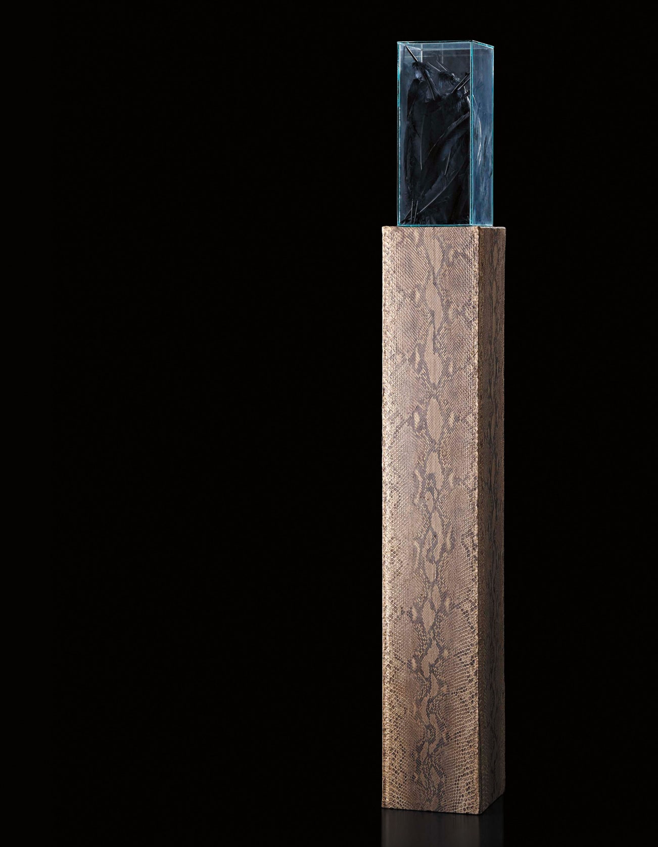 snakeskin covered pedestal and crow feathers in glass vitrine