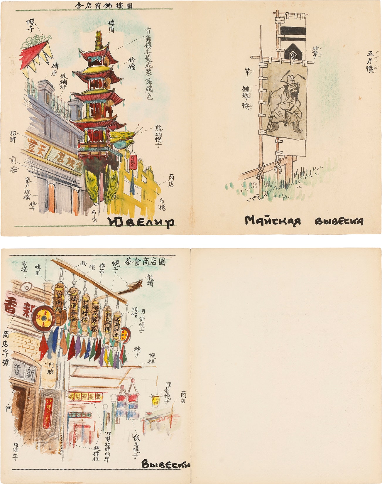 Two works: (i) Jewelry store tower, The May Banner; (ii) Tea house and shops