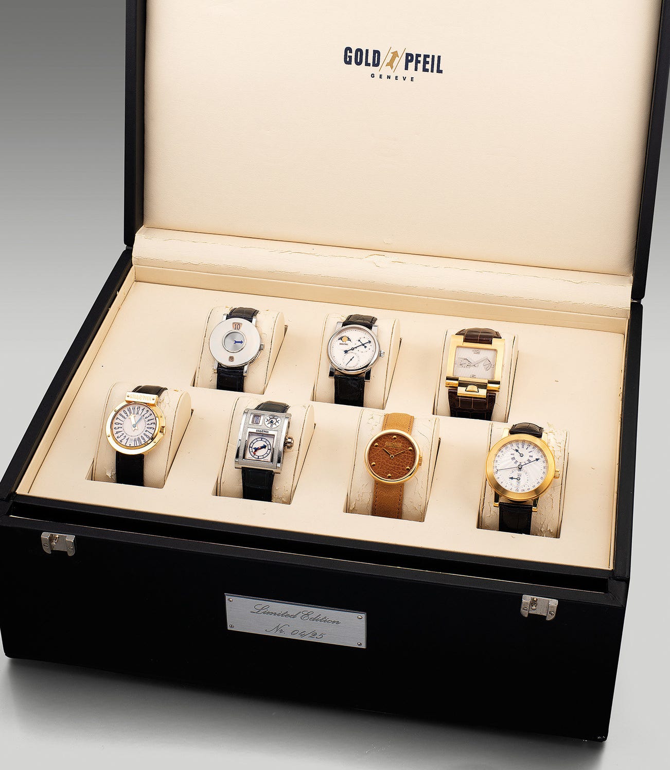 A very fine and rare limited edition set of 7 wristwatches by seven master watchmakers with a large presentation box, numbered 4 out of a limited edition of 25 sets