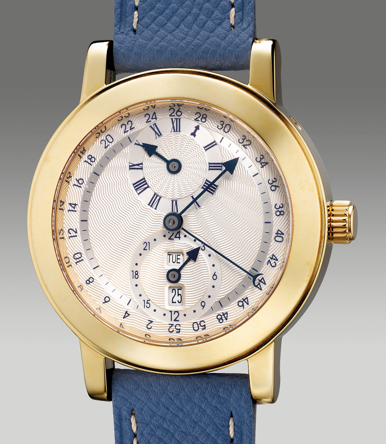 A fine, unusual and rare limited edition yellow gold regulator-style wristwatch with date, day, 24-hour and weekly indication